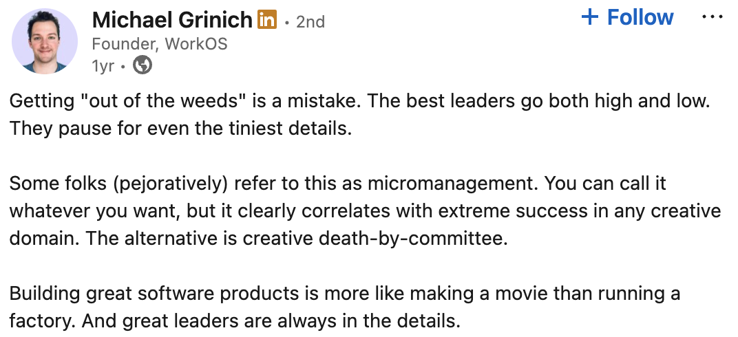 This is one of the secrets to why founder-led companies have superpowers. Founders care about the details, constantly. This mindset doesn’t have to be (and shouldn’t be) limited to founders!