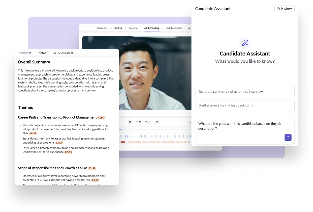 Every interview is automatically captured and summarized, giving your team complete visibility and freeing interviewers to focus on building stronger connections with candidates.