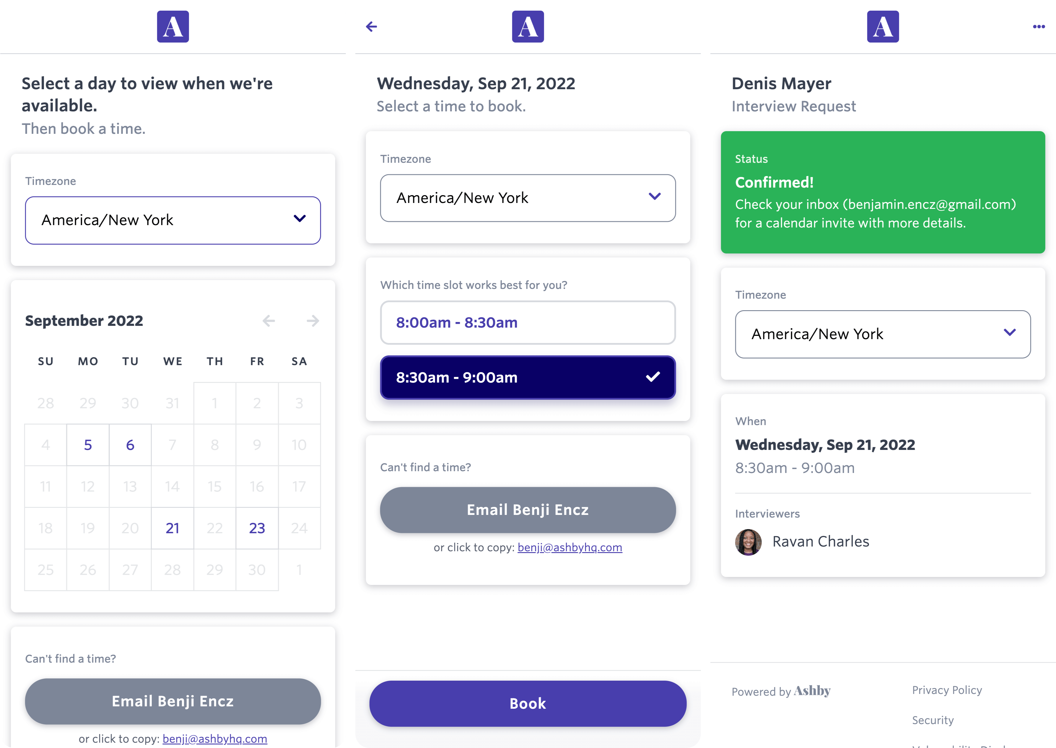Public links anyone can book on. Go from first message, to job stage transition, to scheduled interview. Fully automated.