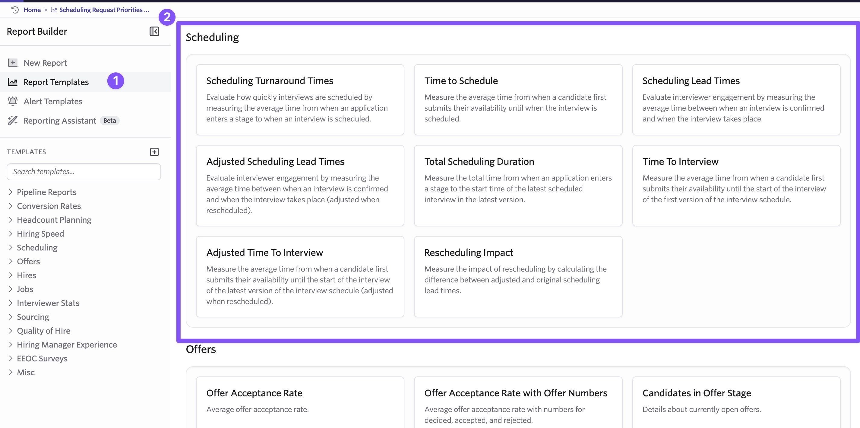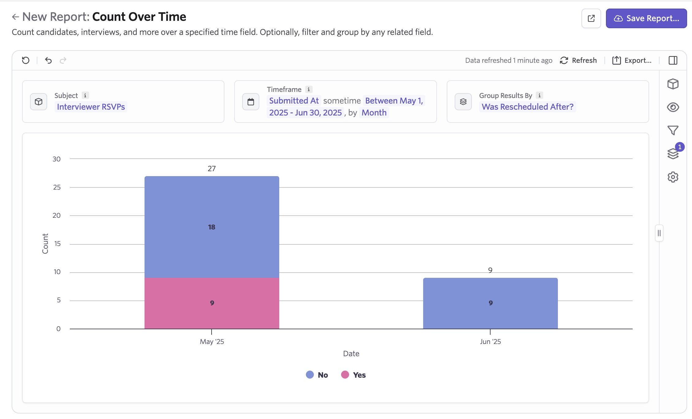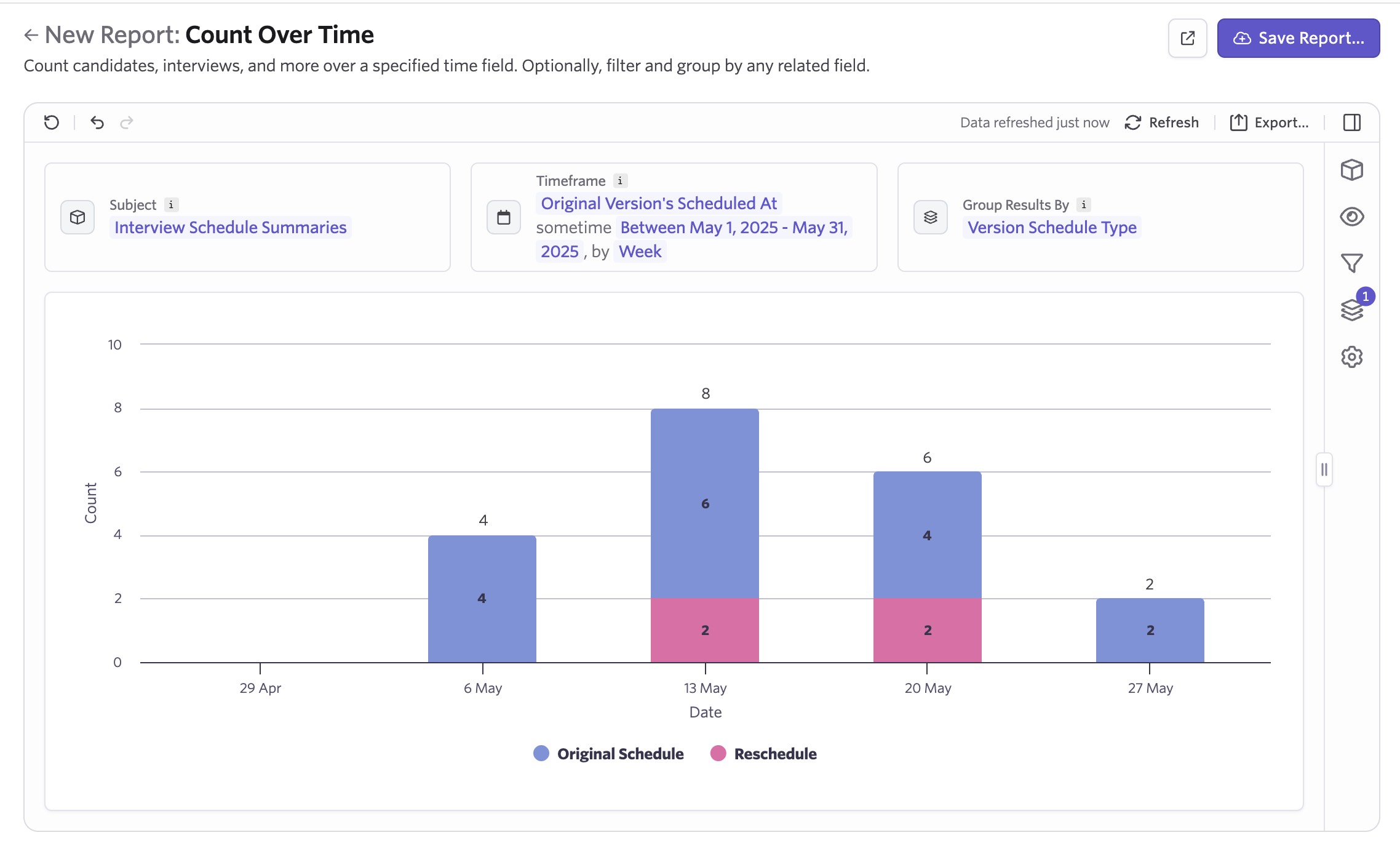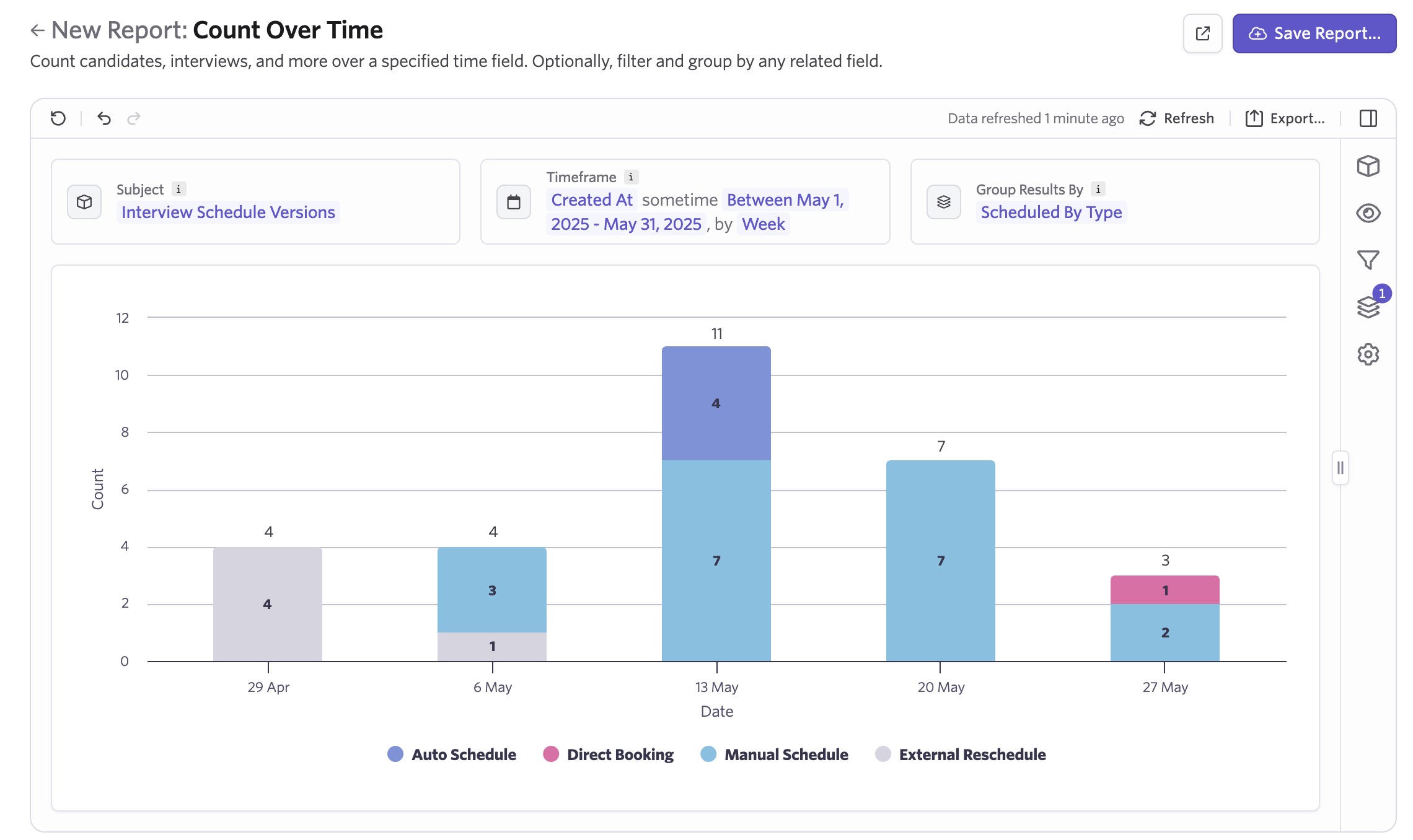 Interview Schedules reporting now gives you visibility into scheduling request activity. If your team sends Scheduling Requests to coordinators or coordination teams, you can now track things like request volume or load directly in your reports.