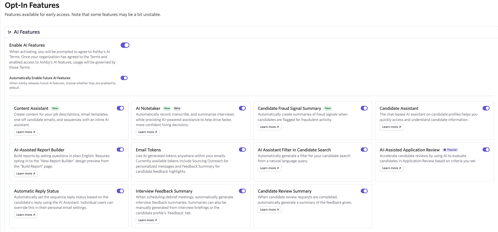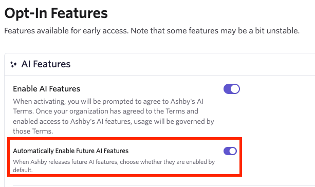 You can also choose which AI features to enable in your Ashby instance. This is helpful when you'd like to review the feature before enabling it for your Organization.