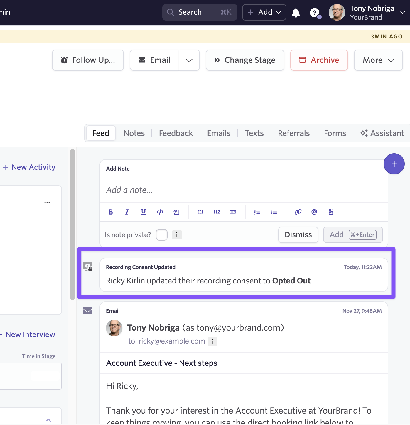 We’ve added better visibility into candidate consent changes by surfacing this activity in the feed on a candidate profile.