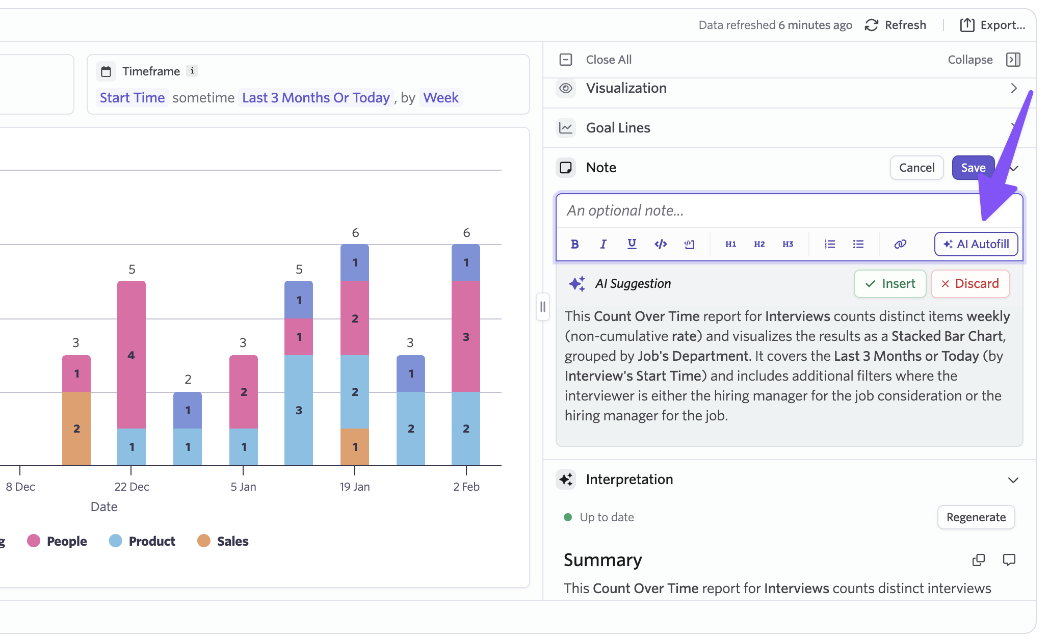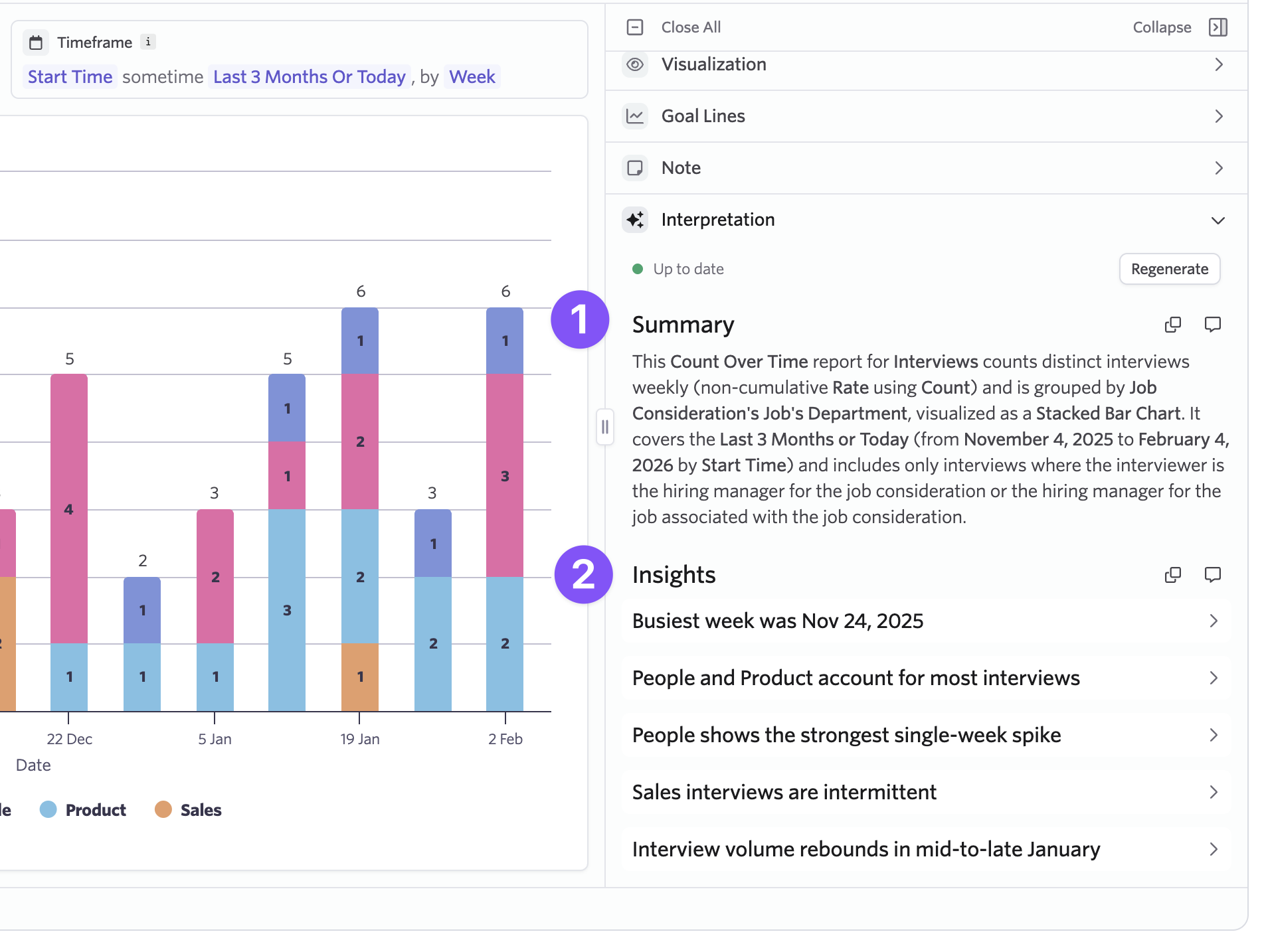For teams sharing dashboards broadly, AI-generated Notes and clear titles help hiring managers and executives self-serve from dashboards. A hiring manager checking where their open roles stand, or a VP reviewing hiring health across departments, can read the note and interpretation to understand what the report covers without asking someone to walk them through it.