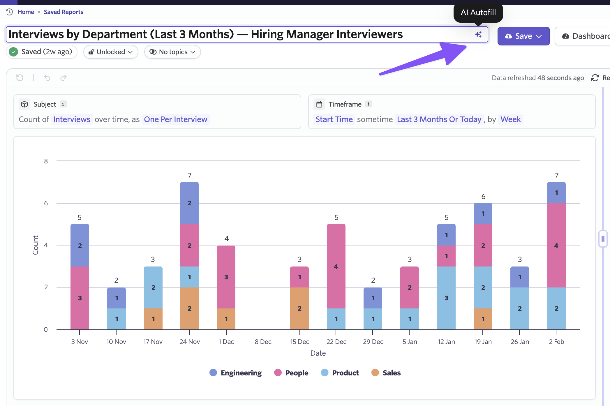 If you're building a report library that your team or hiring managers can self-serve from, clear titles and descriptions go a long way. AI-assisted generation helps you maintain that clarity in a consistent way, especially as the number of reports and dashboards you manage grows.