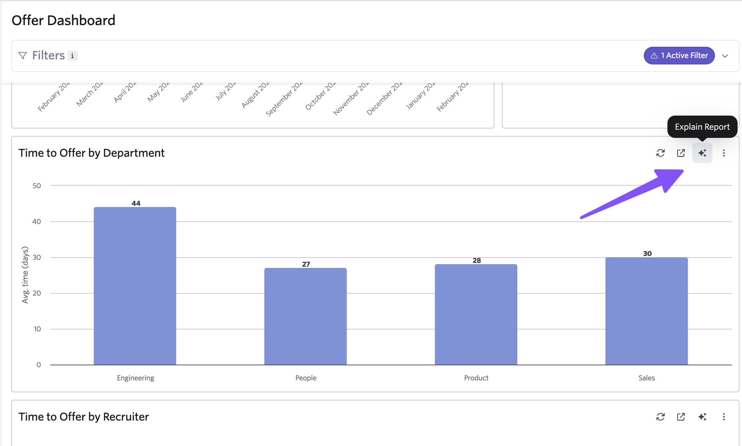 The interpretation reflects any filters applied, so you can confirm what you're looking at before presenting it. For example: "This time to offer by recruiter report is filtered to Engineering and Product departments, located in APAC."