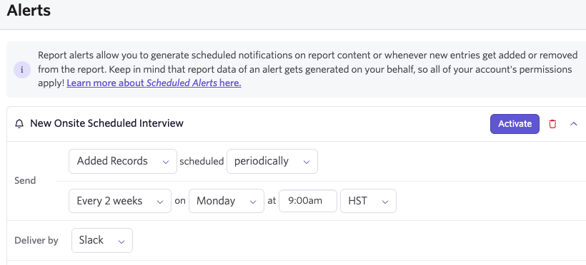 Alerts can now be sent with a more customized cadence. This update lets you send periodic alerts outside the default intervals. For example, if an alert should be sent to stakeholders every two weeks, this can now be set!