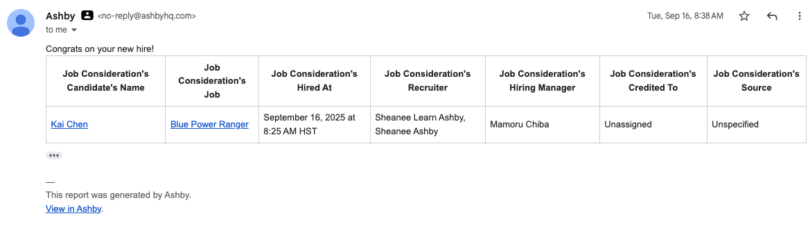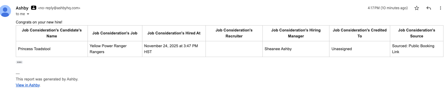 Alerts can now be sent without Ashby links. For example, if an Alert includes a link to the candidate profile in Ashby, you can choose not to include the link to the profile with this setting.