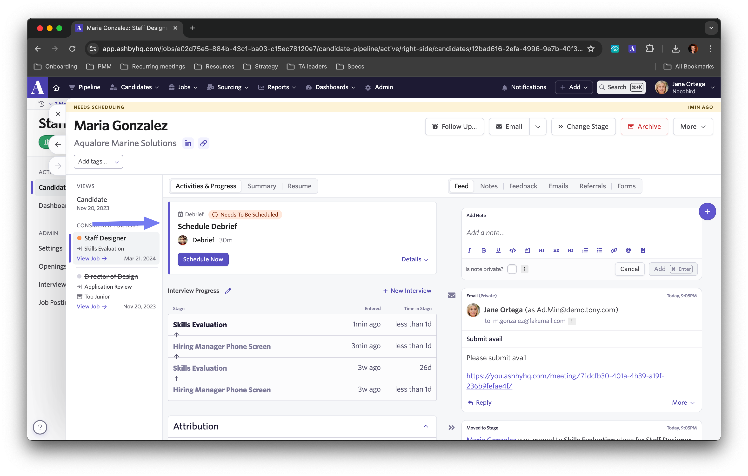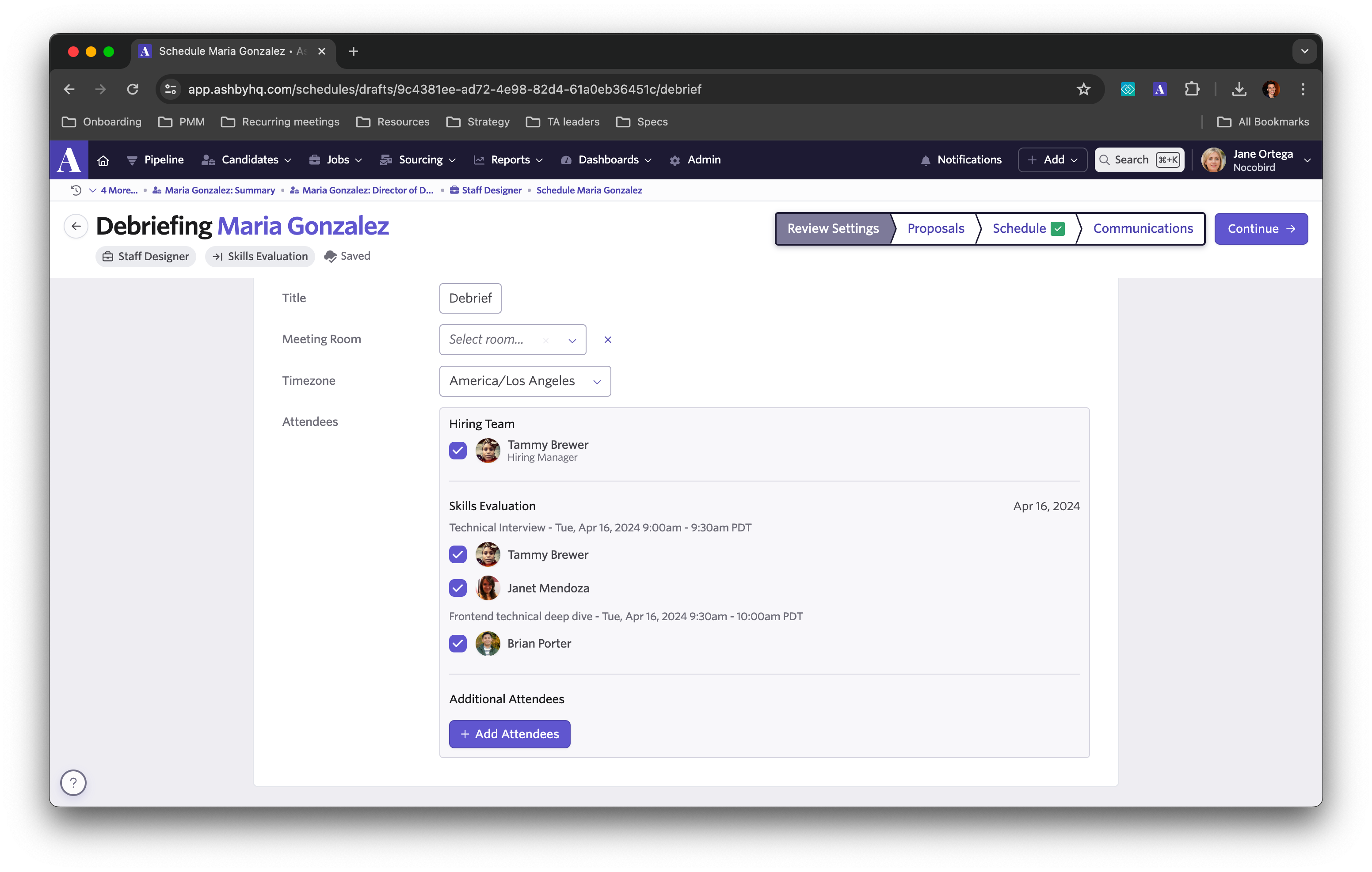 Driving the debrief process from Ashby helps improve hiring decisions by ensuring you can schedule timely debriefs.
