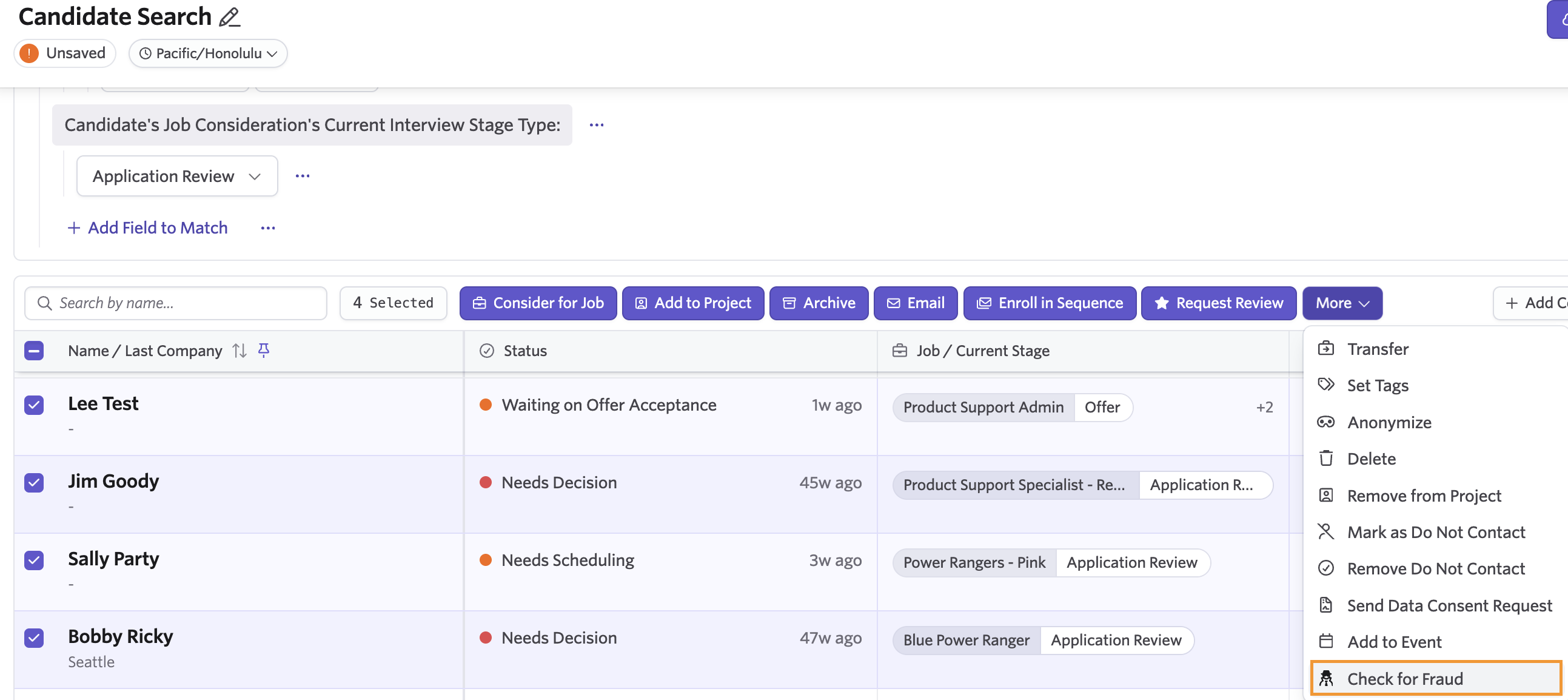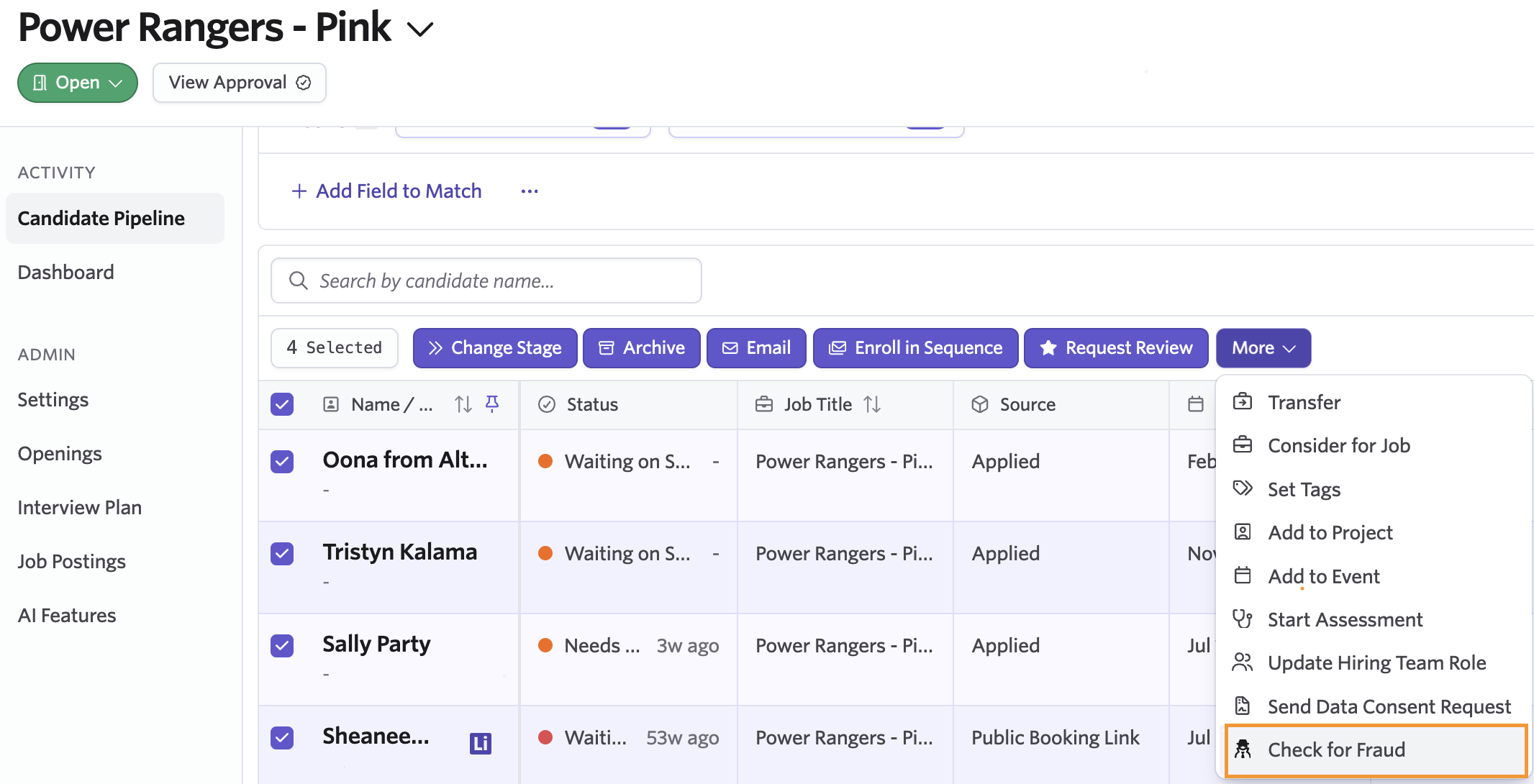 You can now run fraud checks on multiple candidates at once from the candidate or job level, without checking each profile individually.