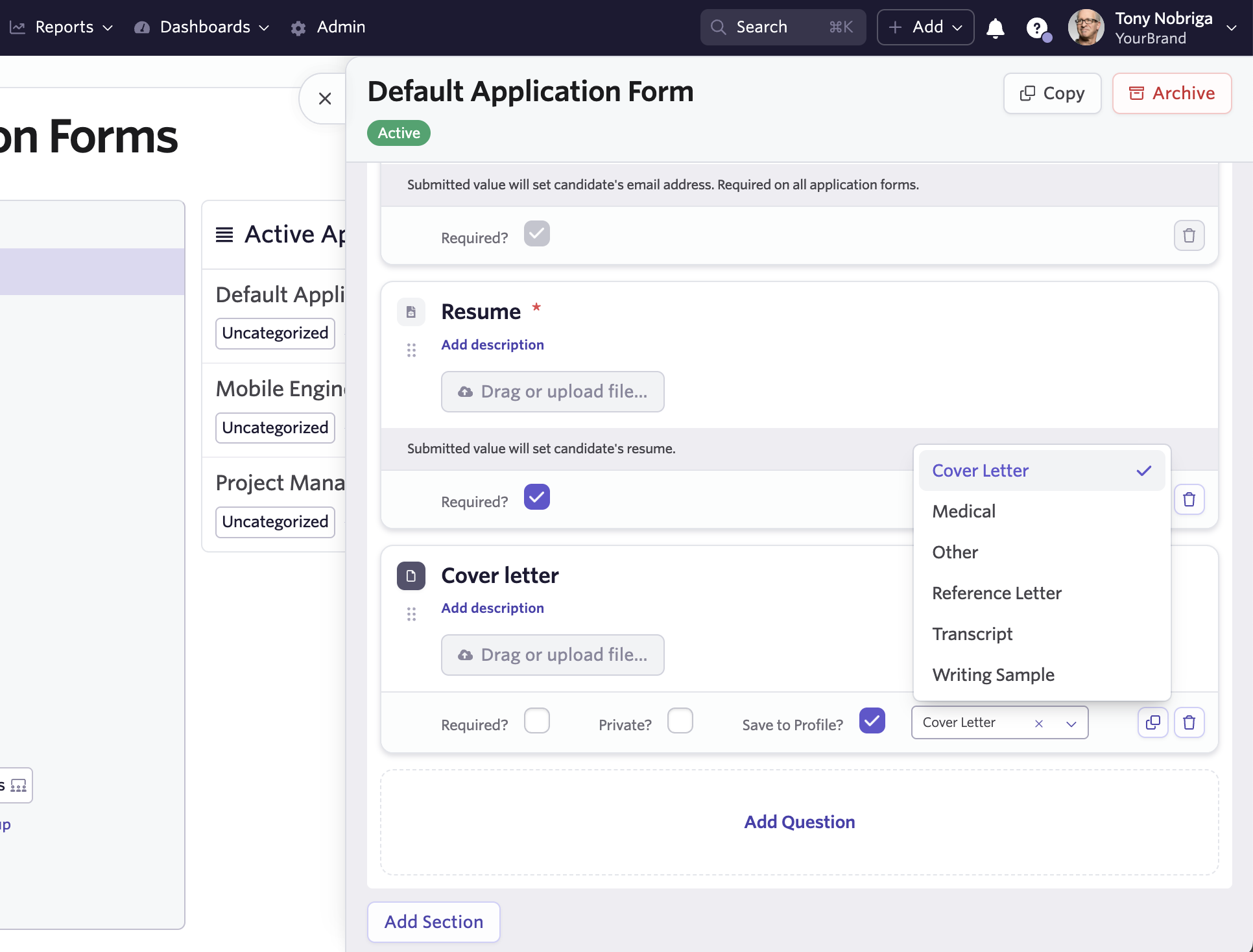 When a candidate submits their cover letter, for example, it's automatically saved to their profile under the cover letter category.