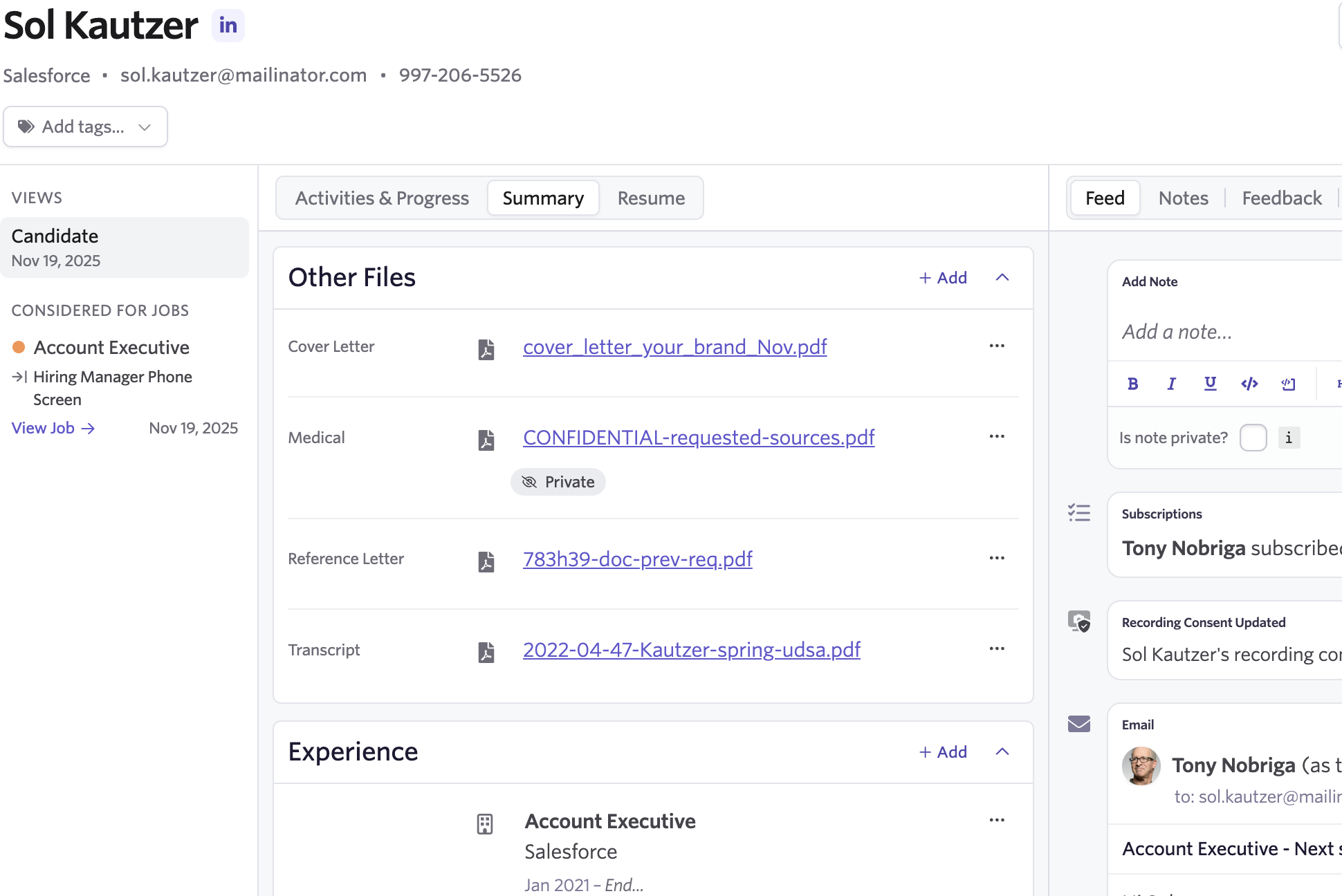 With candidate file categories you now have a low-overhead system for organizing and providing clarity to files attached to your candidates. Application form automation means files are categorized from the start without any manual work.