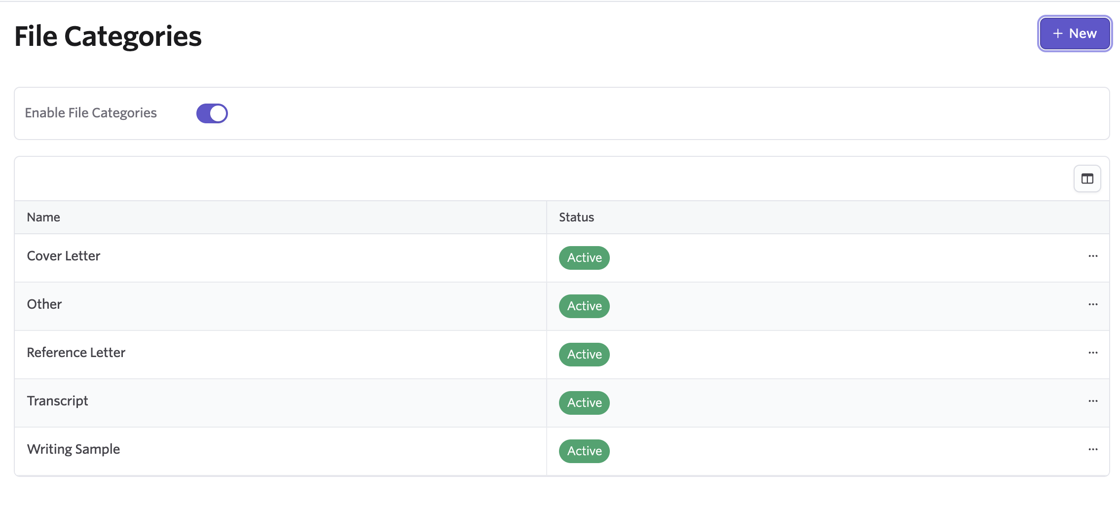 Enable file categories in your admin settings to get started. Once enabled, you'll see a set of preloaded categories (cover letter, transcript, etc.) that you can rename, archive, or add to.