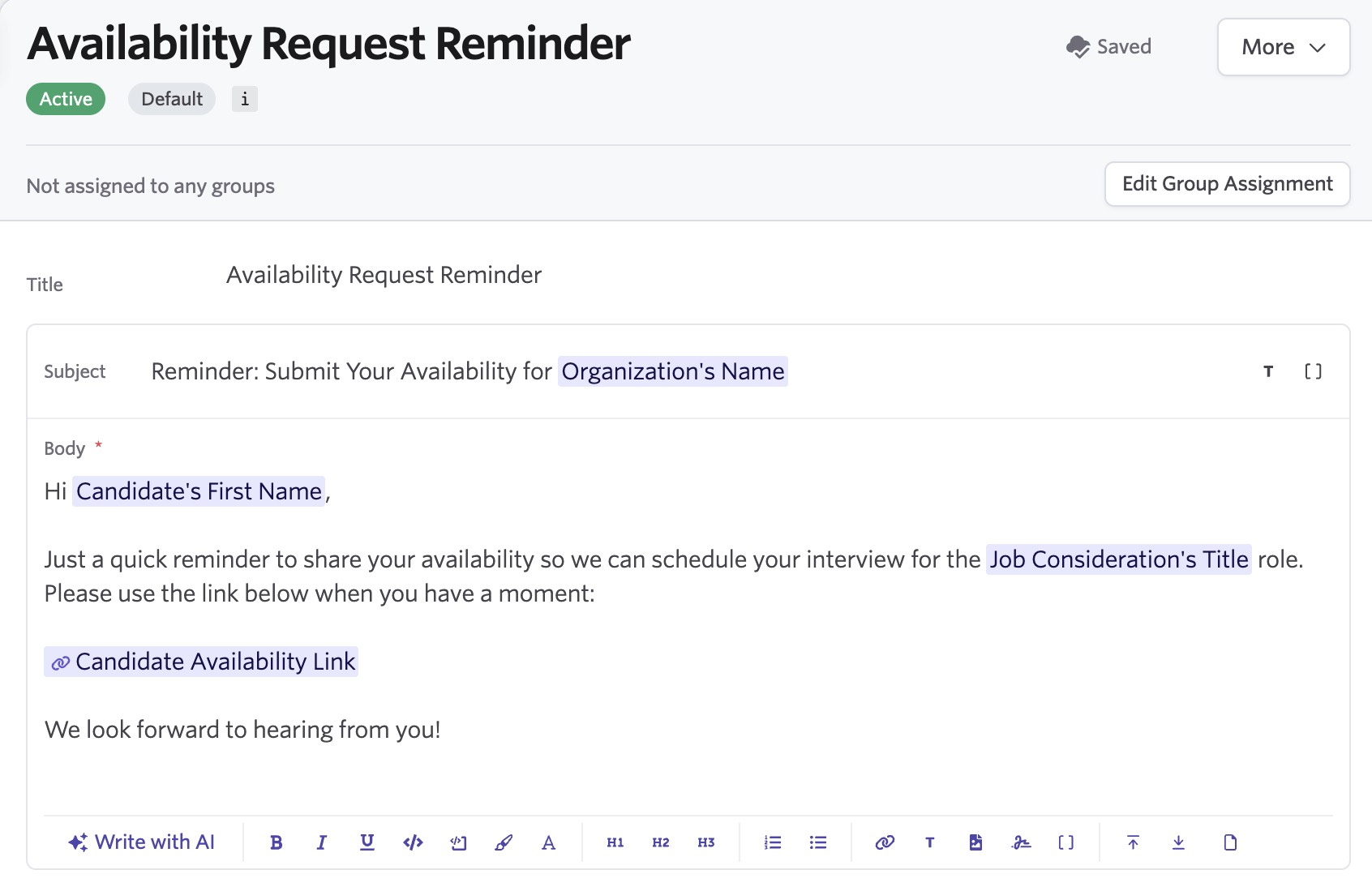 Here’s an example of the default Availability Request reminder template: