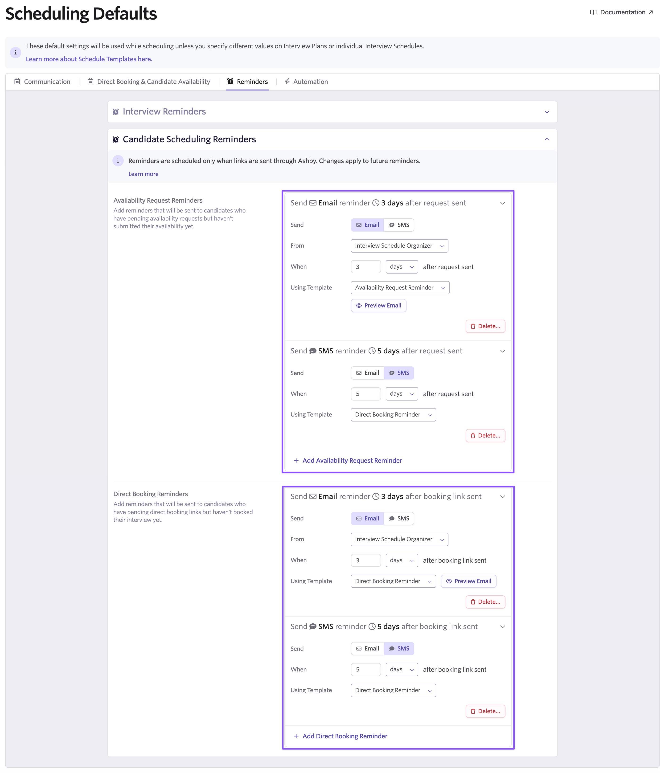 Automated candidate scheduling reminders are available across all plans. Get started by visiting your Scheduling Defaults or any individual Schedule Template and opening the Reminders tab. For step-by-step guidance, visit our Ashby Knowledge Base.