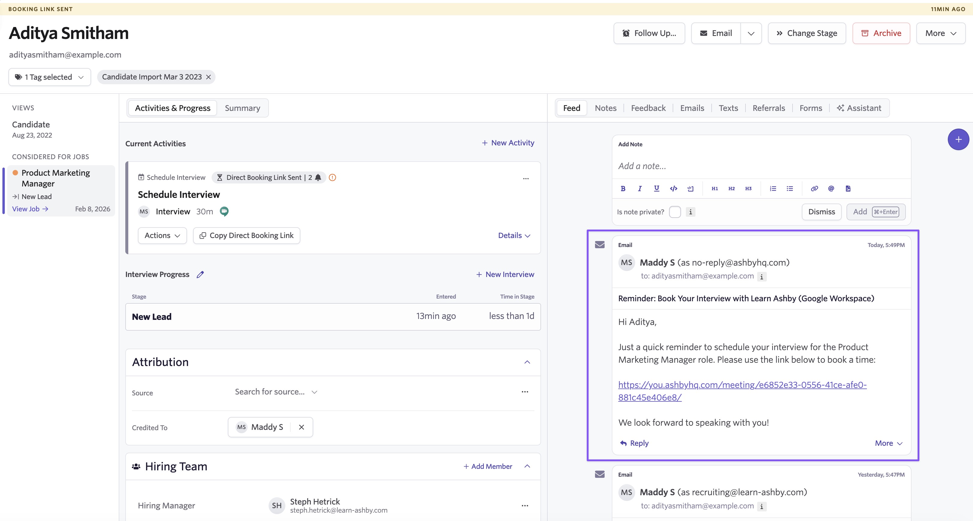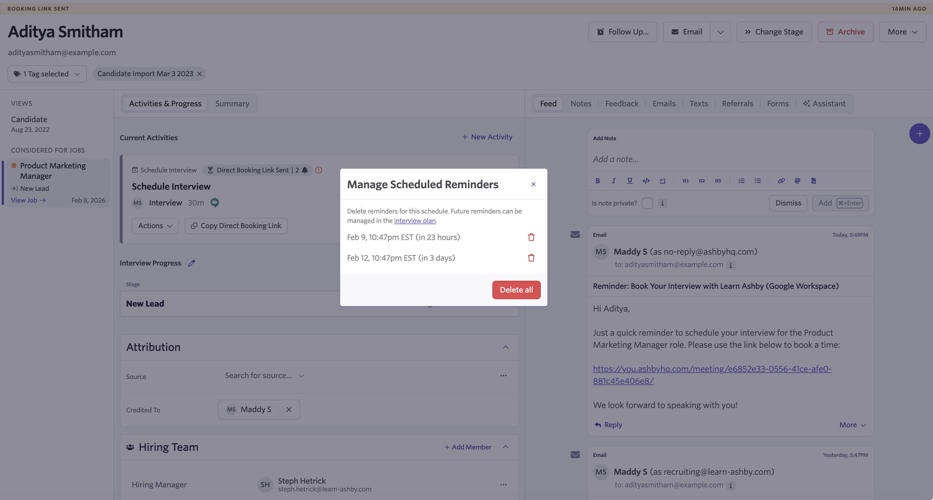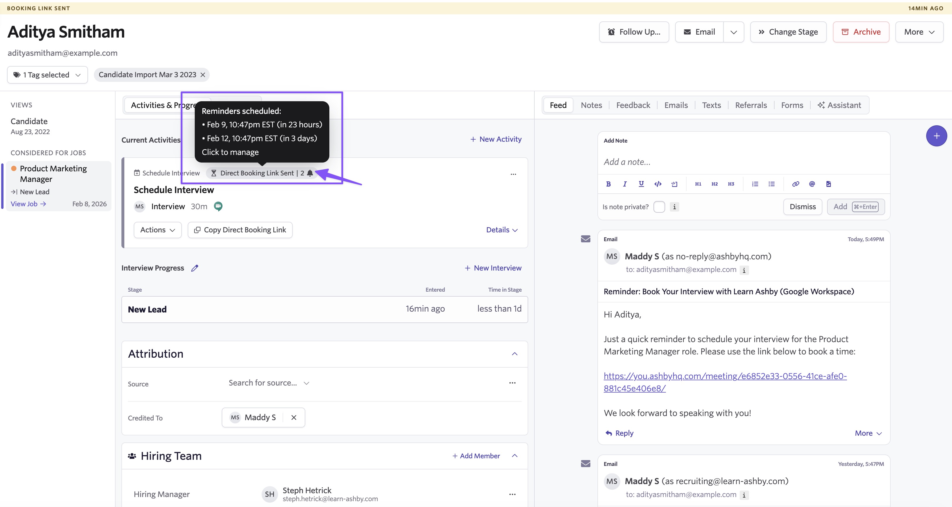 For reminders to work, scheduling requests and Direct Booking links must be sent through Ashby. This helps teams keep scheduling on track without relying on personal reminders or manual follow-up.