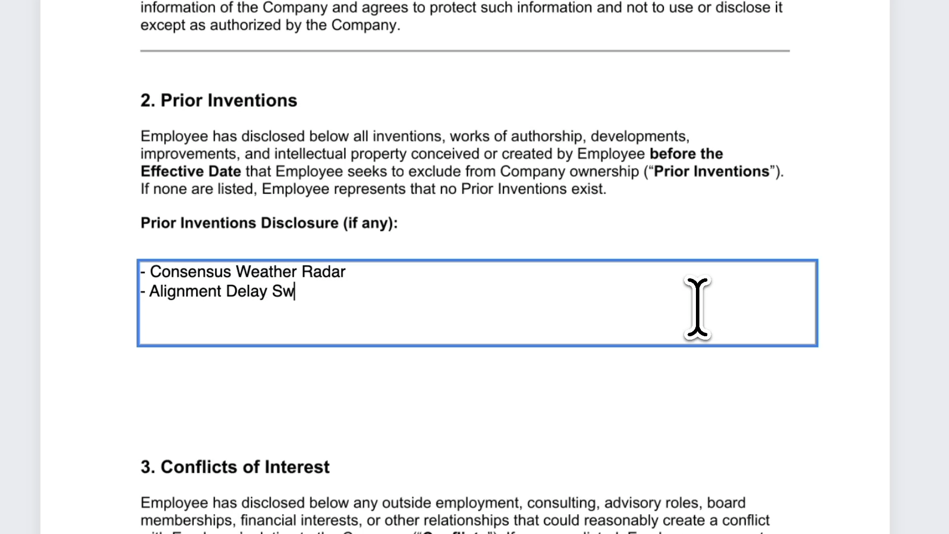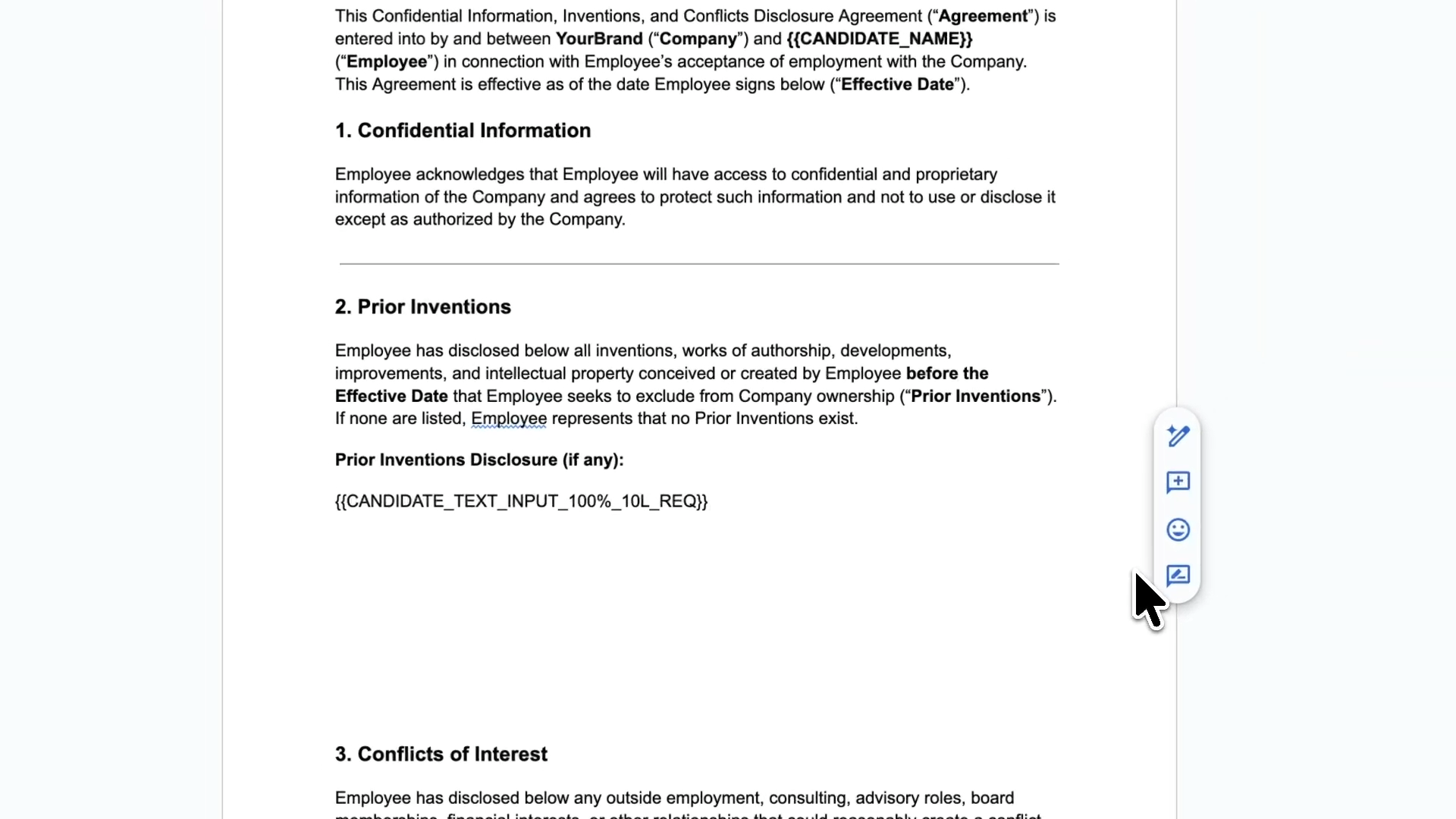 When sending offers or E-signature documents like NDAs, you may need to collect candidate input beyond their signature - things like IP disclosures, invention assignments, or other acknowledgments.