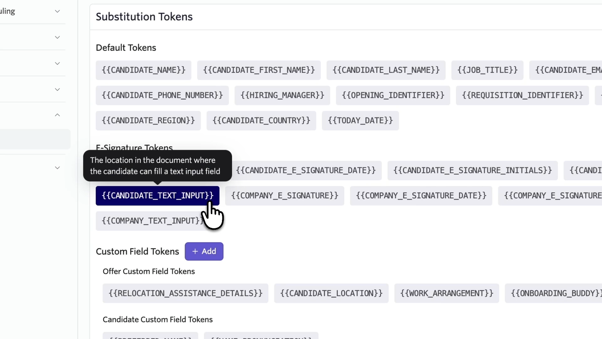 E-signature text input tokens are available across all plans. Go to any E-signature or offer token tab and look for the new tokens to configure and place into your templates.