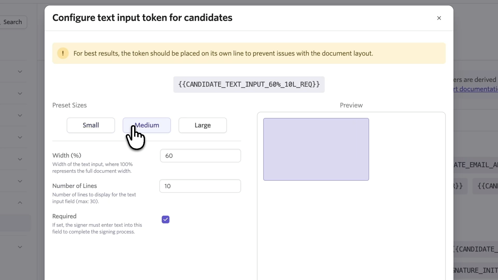 - Presets: Choose small, medium, or large. A preview on the right shows how the field will render in your document.