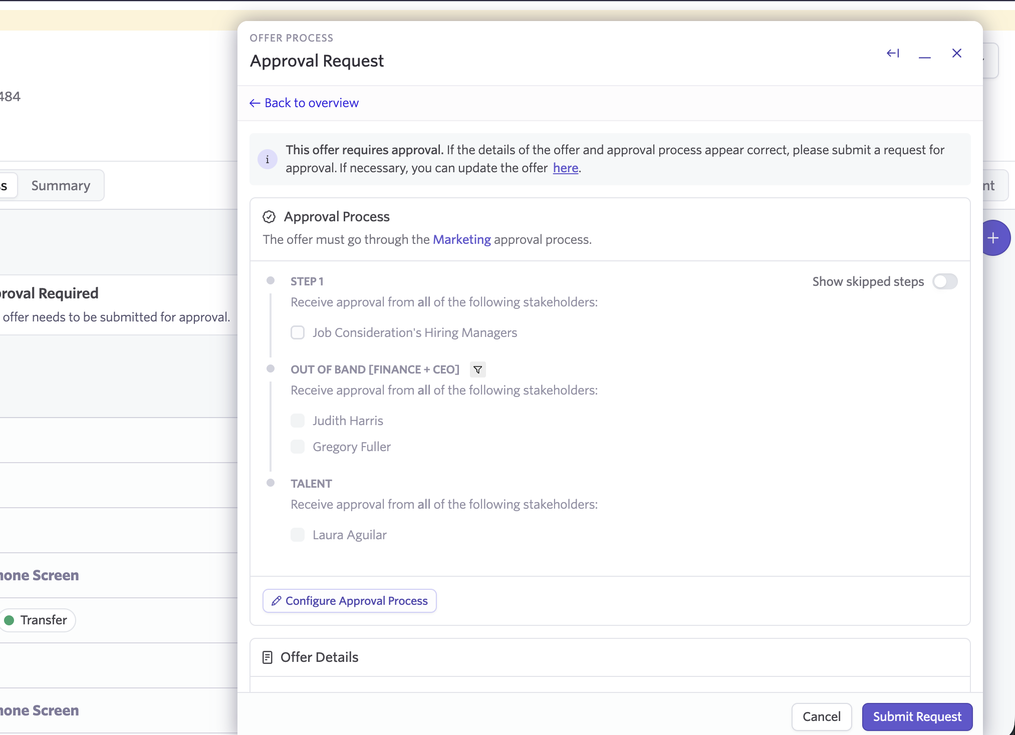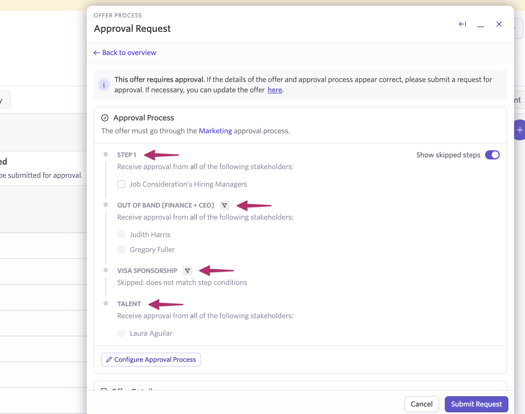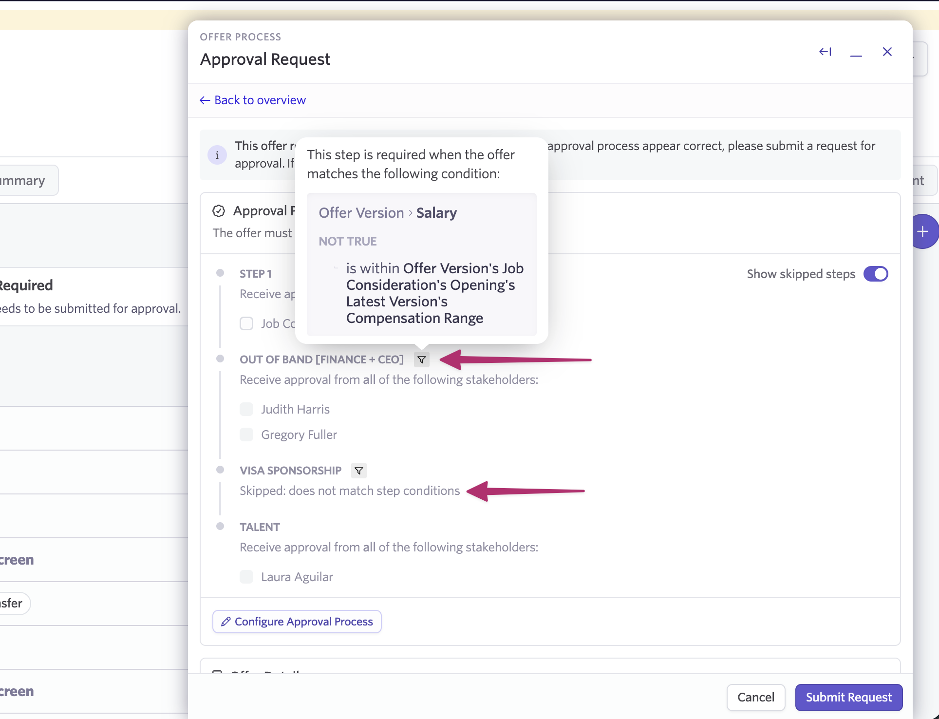 When someone submits an approval request (e.g. on an offer), they can see which conditional steps will be triggered and which will be skipped.