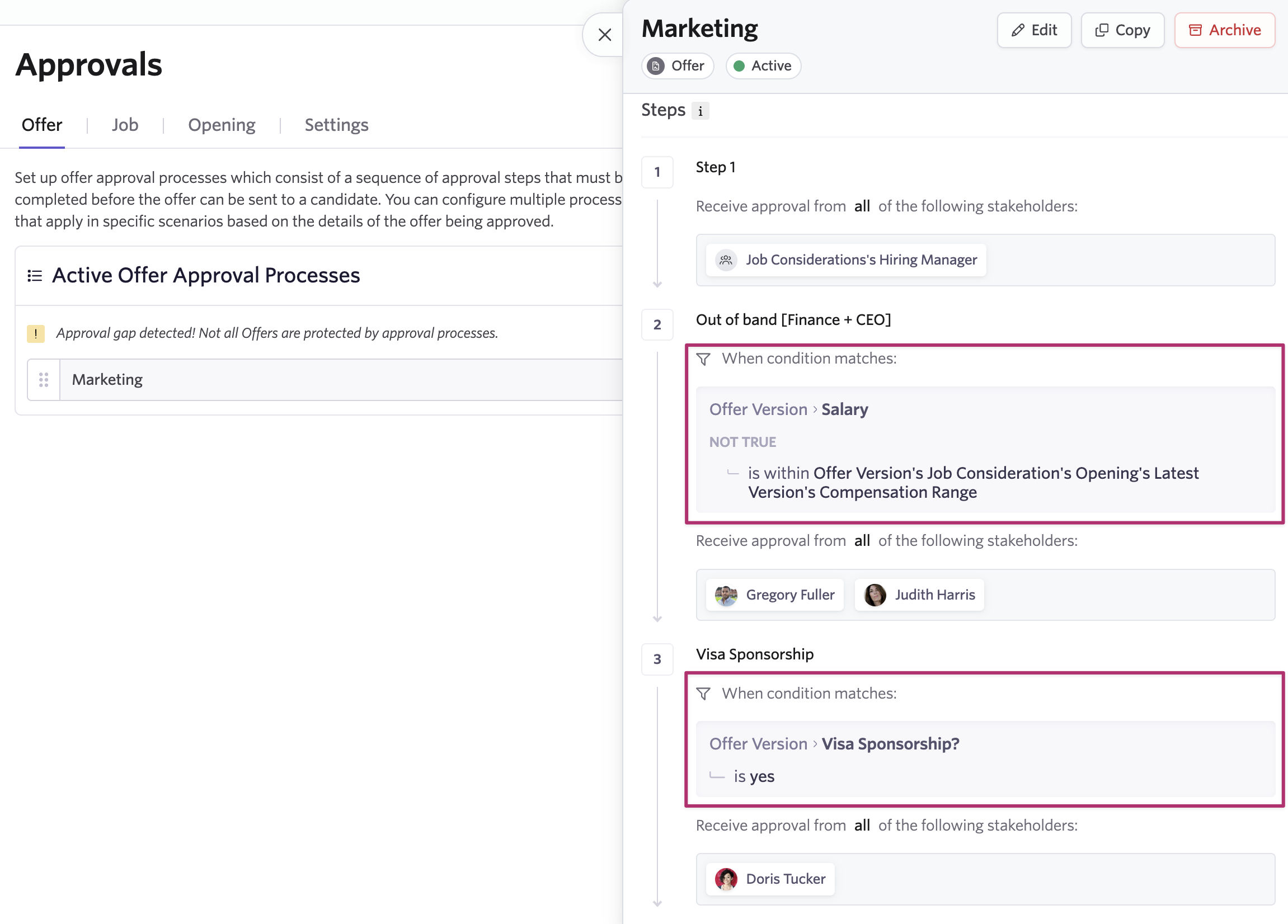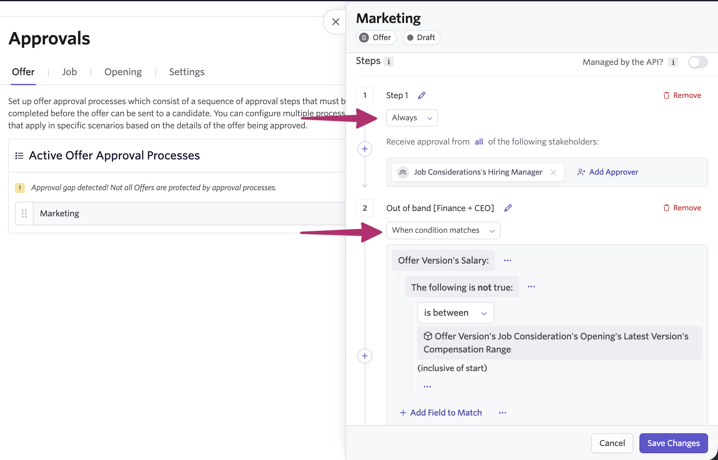 For example, you can trigger a step when an offer's salary exceeds the opening's compensation range.