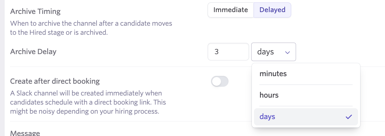 - Delayed: Choose to archive the Slack channel several minutes, hours, or days after the candidate is hired or their job consideration is archived.