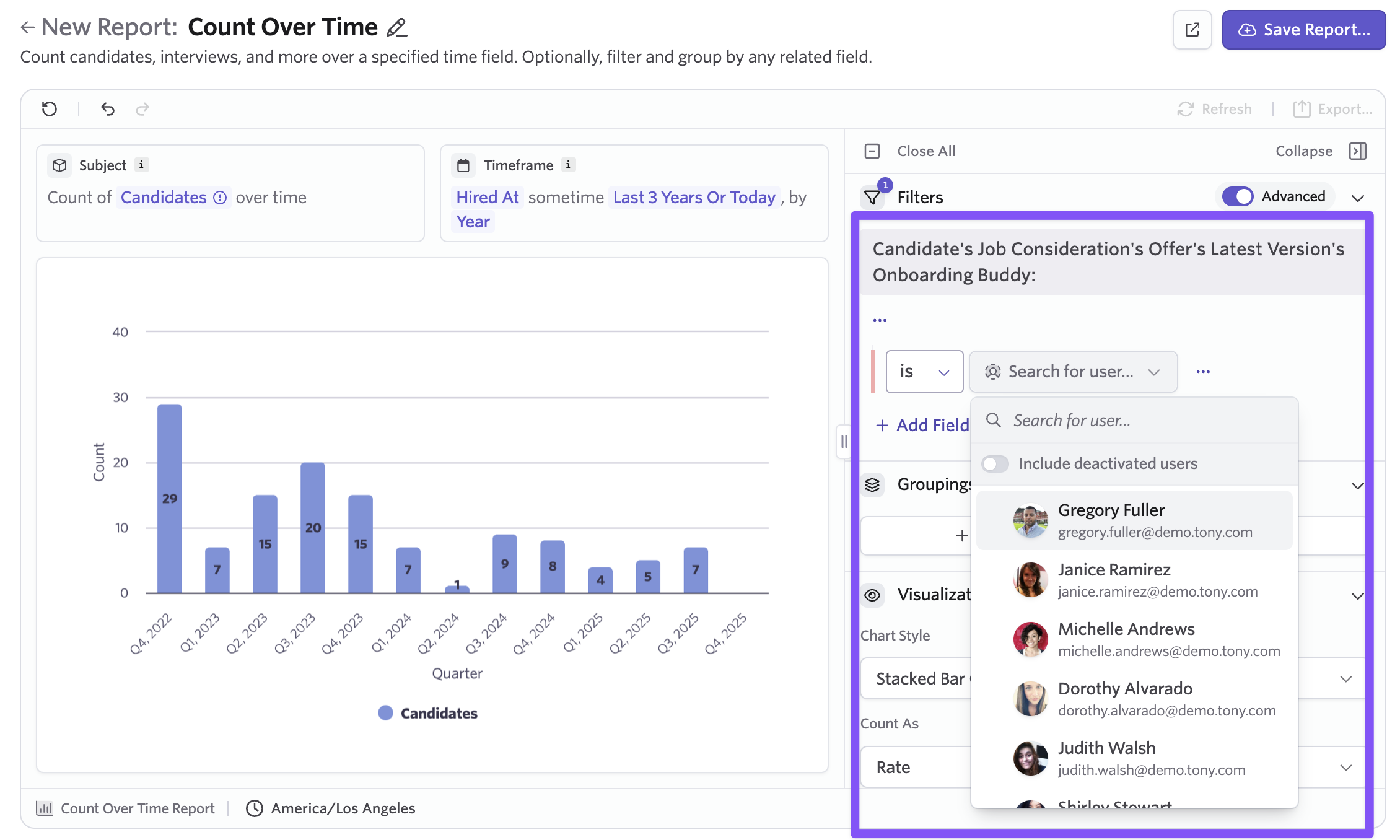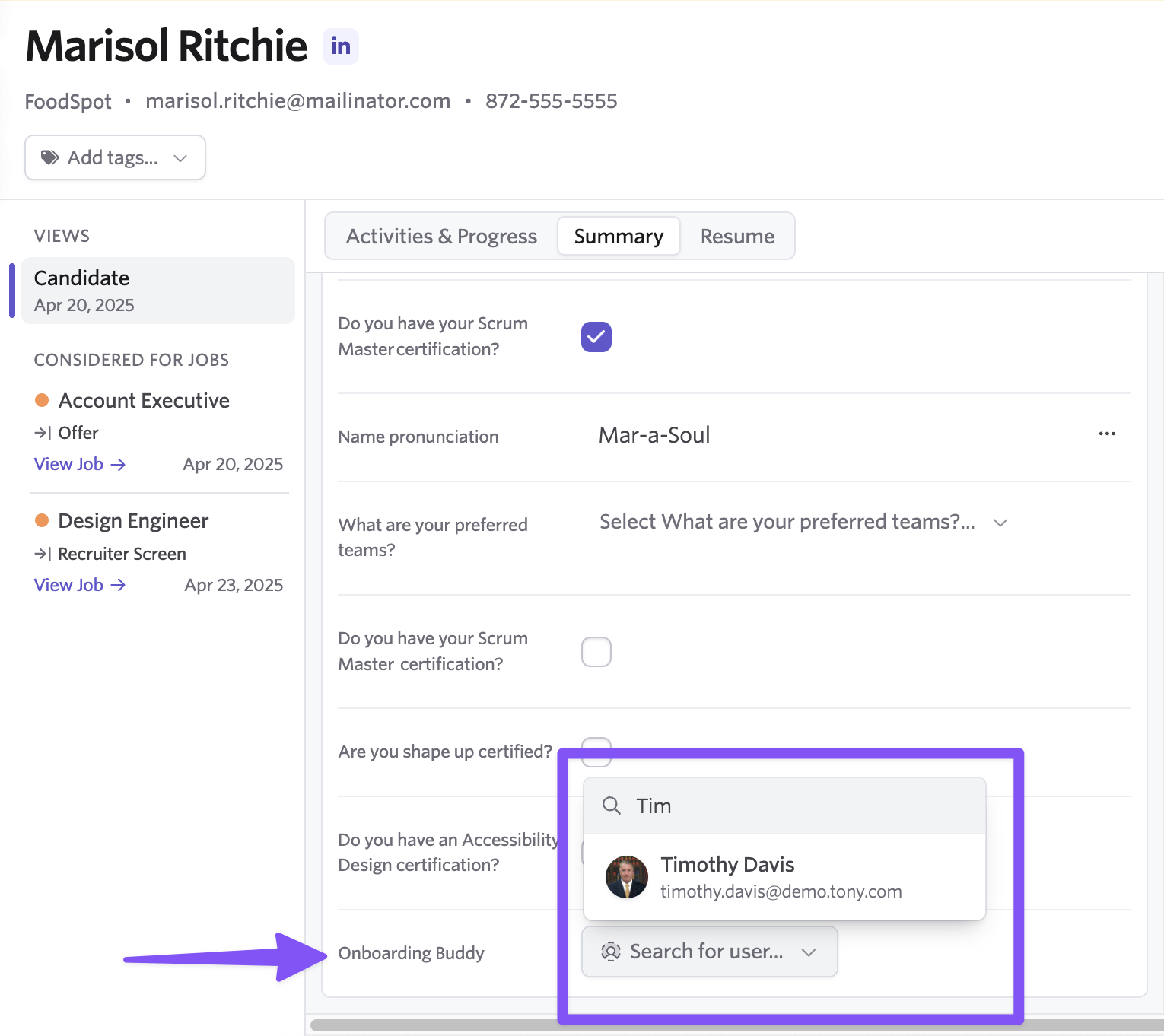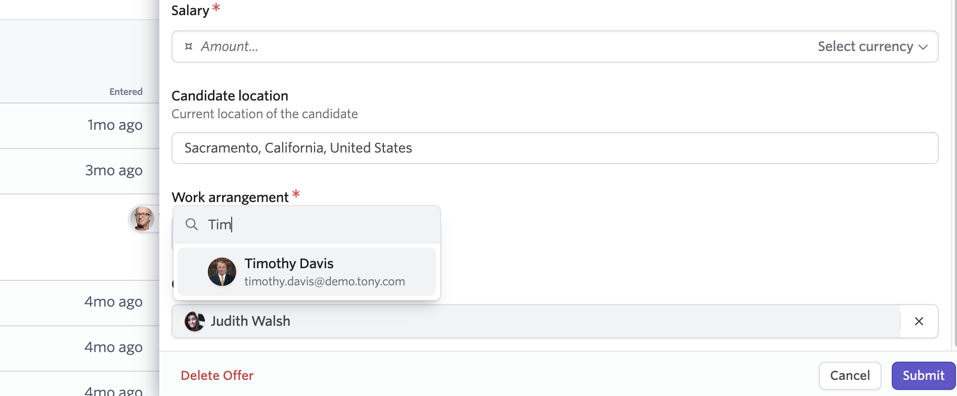 This gives you a structured way to associate Employees, via custom fields, to various objects in Ashby: Candidate, Job, Offer, and more.