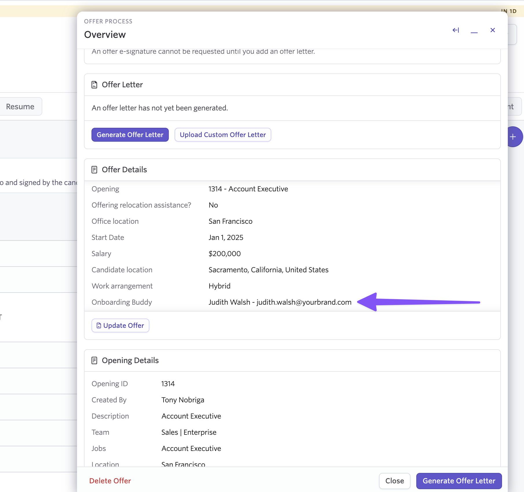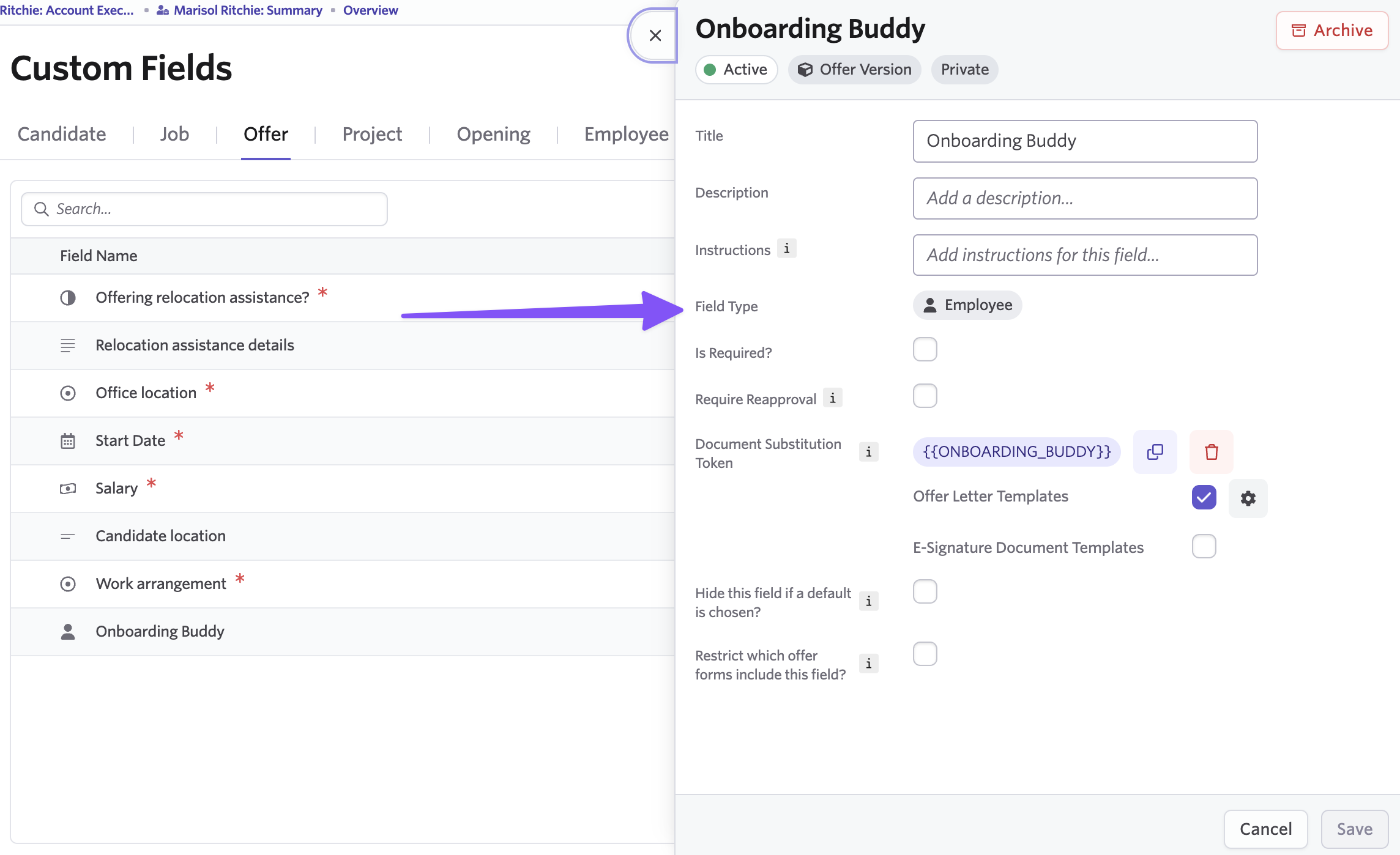 As an example, if you have an "onboarding buddy" custom field with an employee field type you can easily pull in their name to the offer letter without needing to type it out.