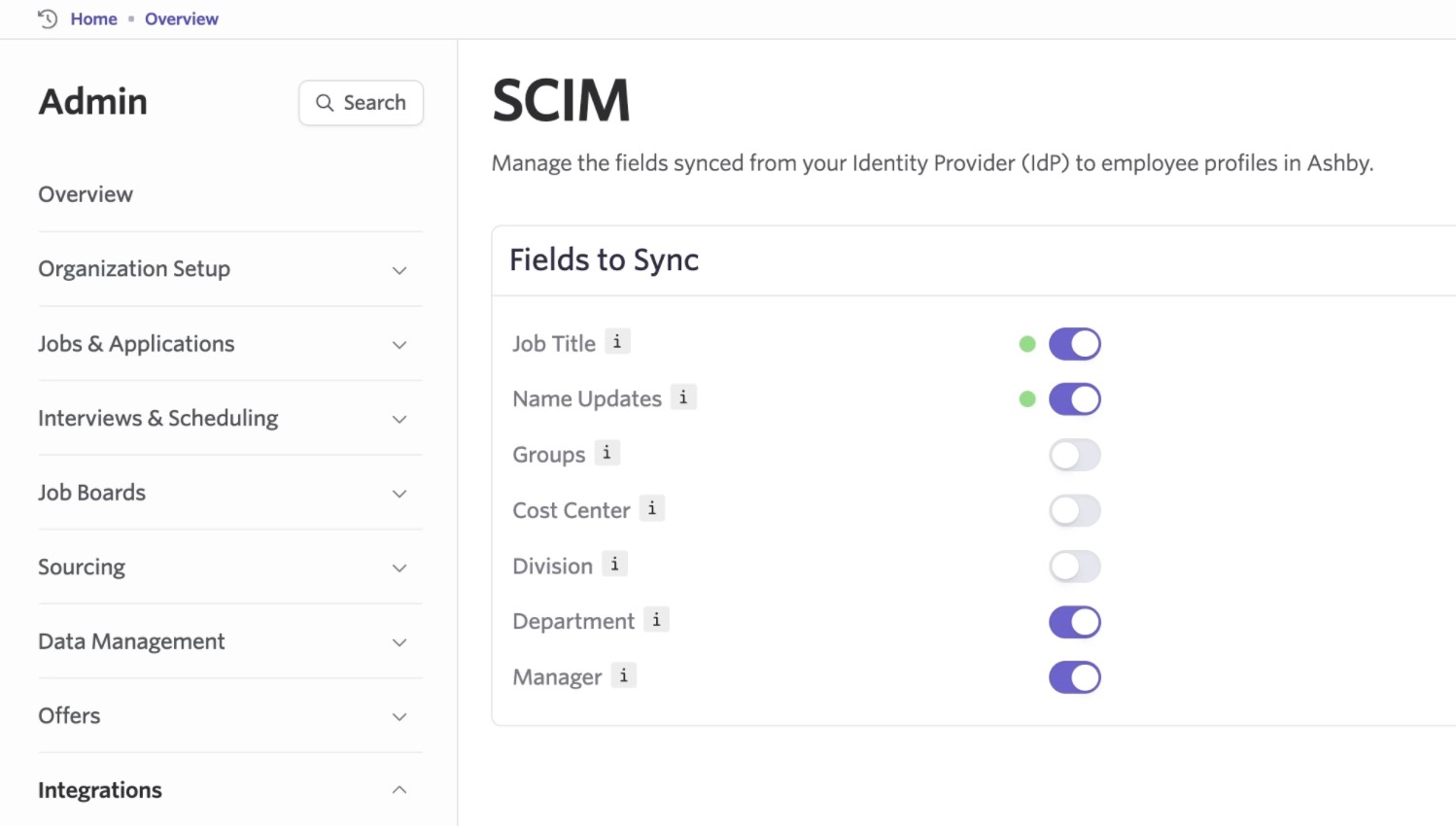 Go to Admin > Integrations > SCIM, then select the fields you want to sync. These fields will appear on Employee Profiles in Ashby and stay up to date as changes are made in your identity provider.