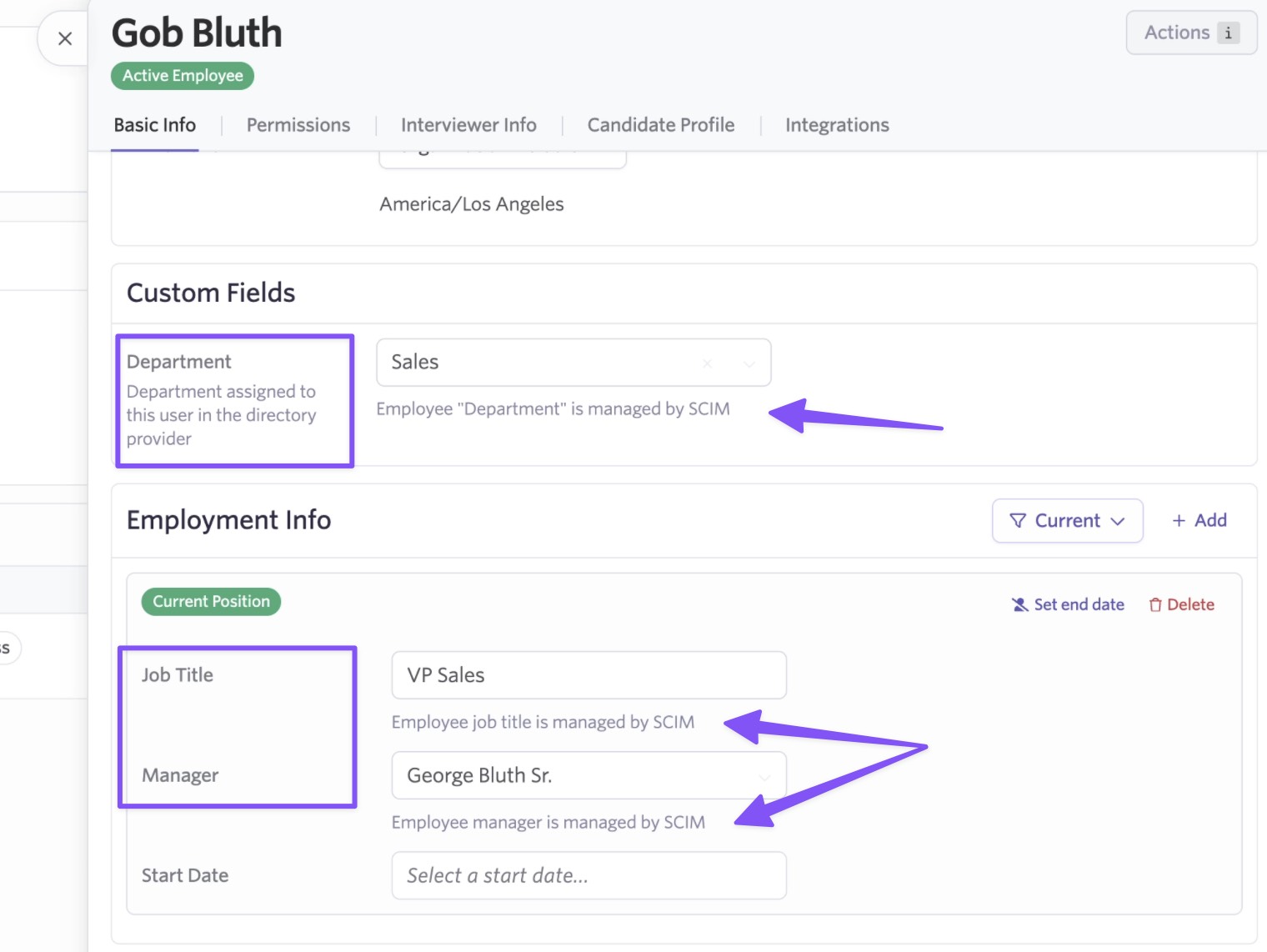 Job Title, Name, and Manager are immediately useful for most teams. When someone gets promoted, changes their name, or moves to a new manager, those updates automatically flow into Ashby, so there’s no need to track changes or update records manually.