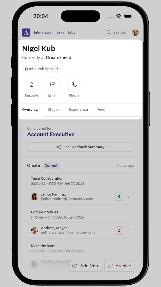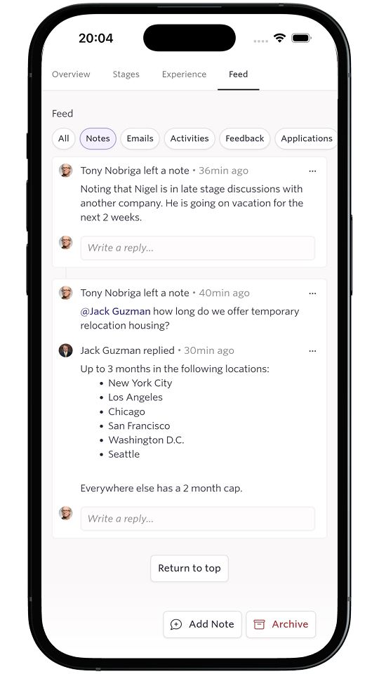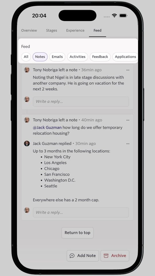 You can now jump to any item in the feed on the candidate profile by tapping Notes, Emails, Activities, Feedback, Application.