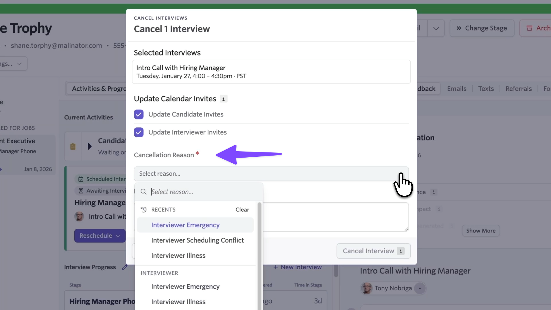 When rescheduling, cancelling an interview, or deleting a scheduled interview, users within Ashby will be prompted to select a reason and add context. This captures structured data at the source, so you can report on trends and identify patterns over time.