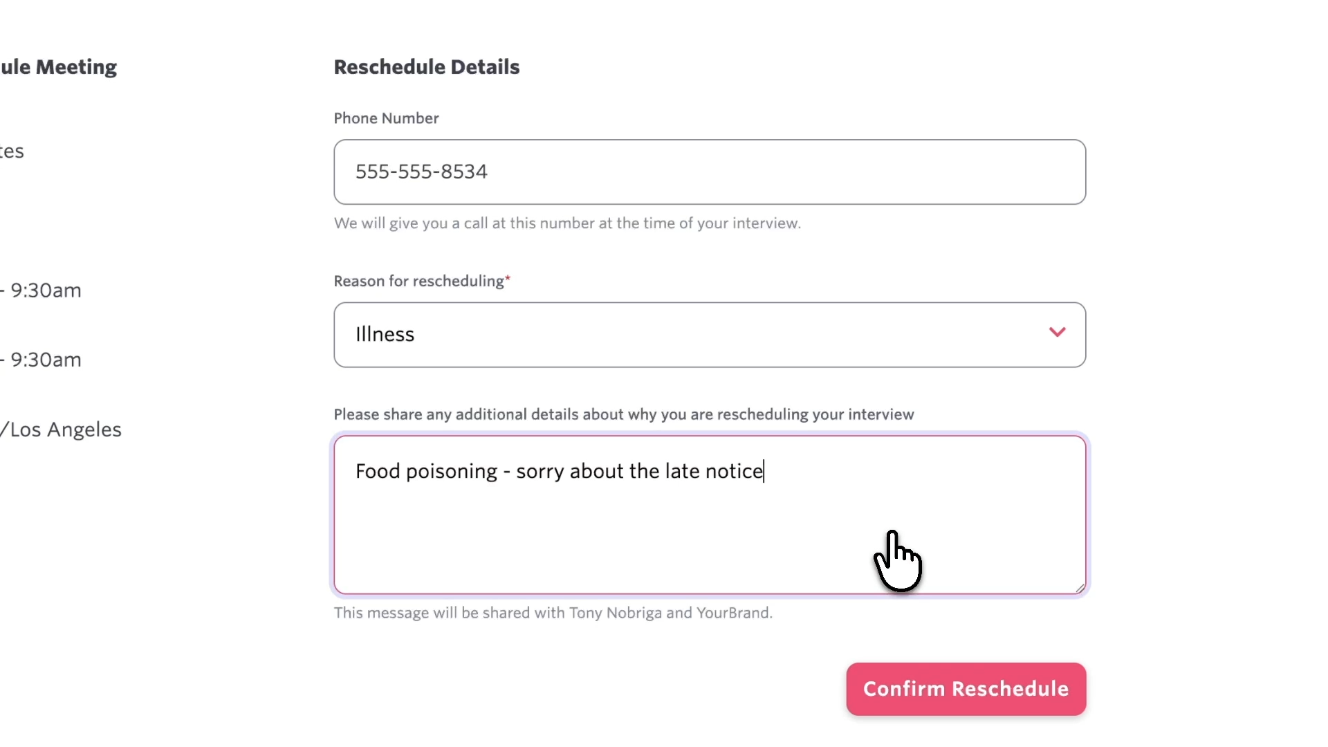 For candidates using Direct Booking Links (all plans): When candidates reschedule or cancel via their direct booking link, you'll have the option to prompt them to select a reason and optionally leave a note explaining the change.