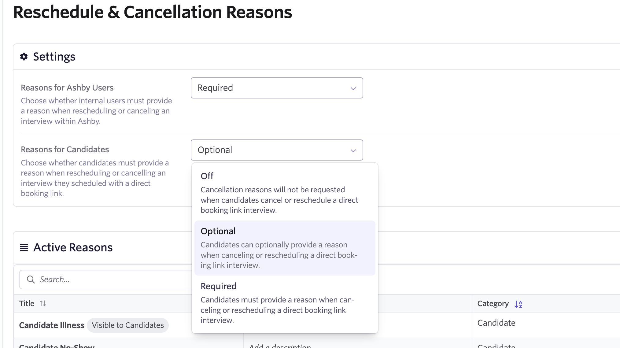 Control candidate visibility: Choose which reasons candidates can select from. Not all reasons make sense for candidates to choose themselves (like "candidate no-show")