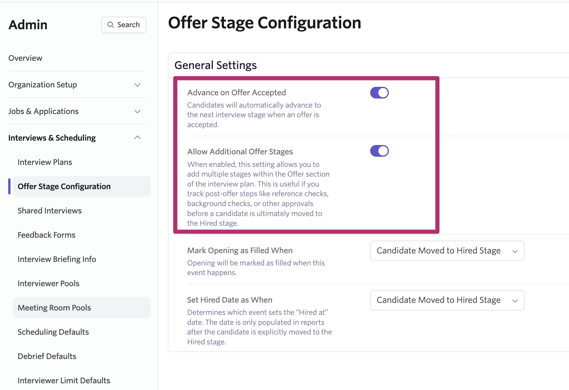 It's enabled by default and matches existing behavior. This is really nice because once you've added multiple offer stages you still can have your candidates automatically advance once the offer is accepted, but they move to an offer stage of your choice (instead of hired) ensuring your reporting is clean.