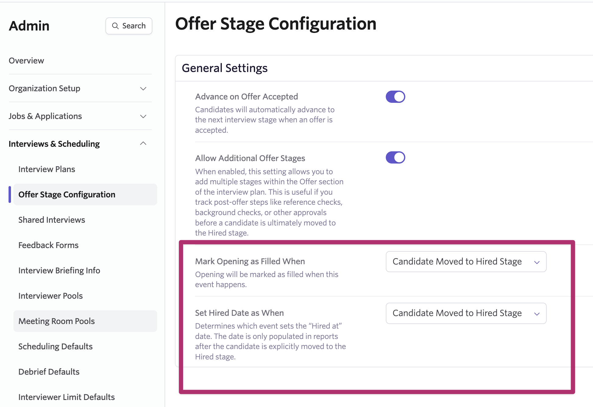 Turning on Additional Offer Stages also lets you dertermine how the hire date is set and when an opening is considered filled: