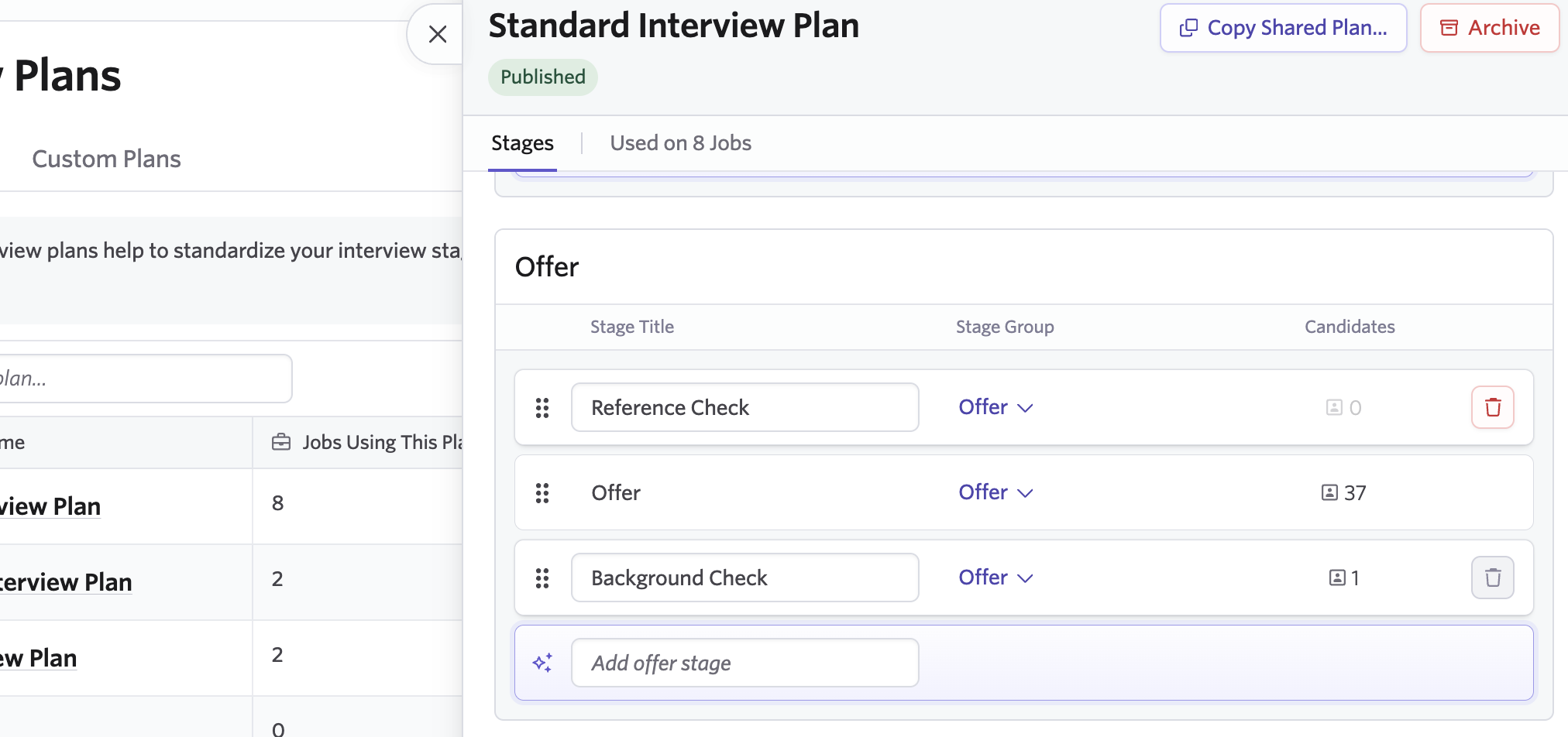 When enabled, you can create custom offer-type stages within any interview plan - stages like Background Check, Reference Check, Physicals, or Pre-Hire Training.