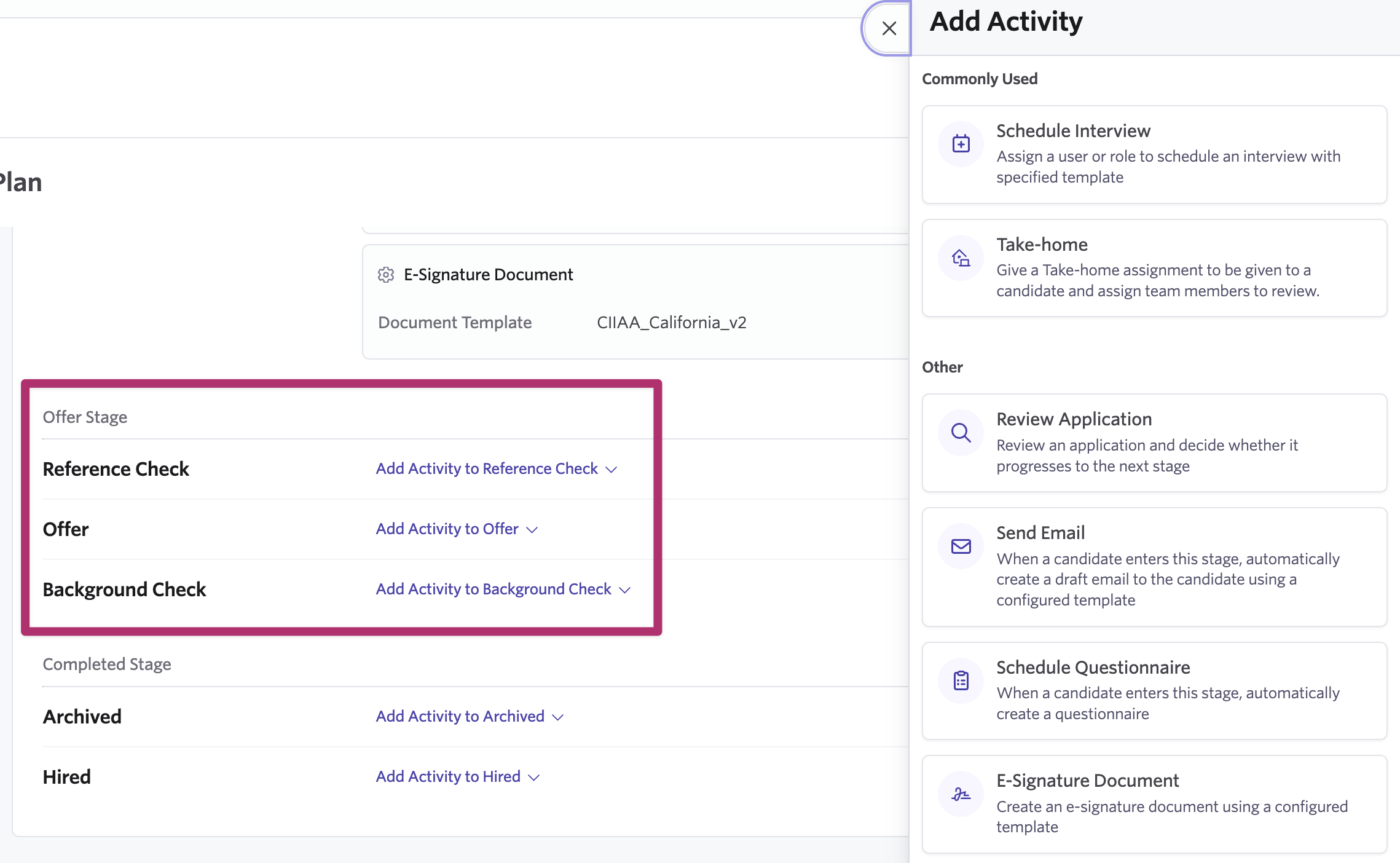 Now, when setting up your interview plans you'll see the new offer stages and the ability to add activities as you would normally expect.
