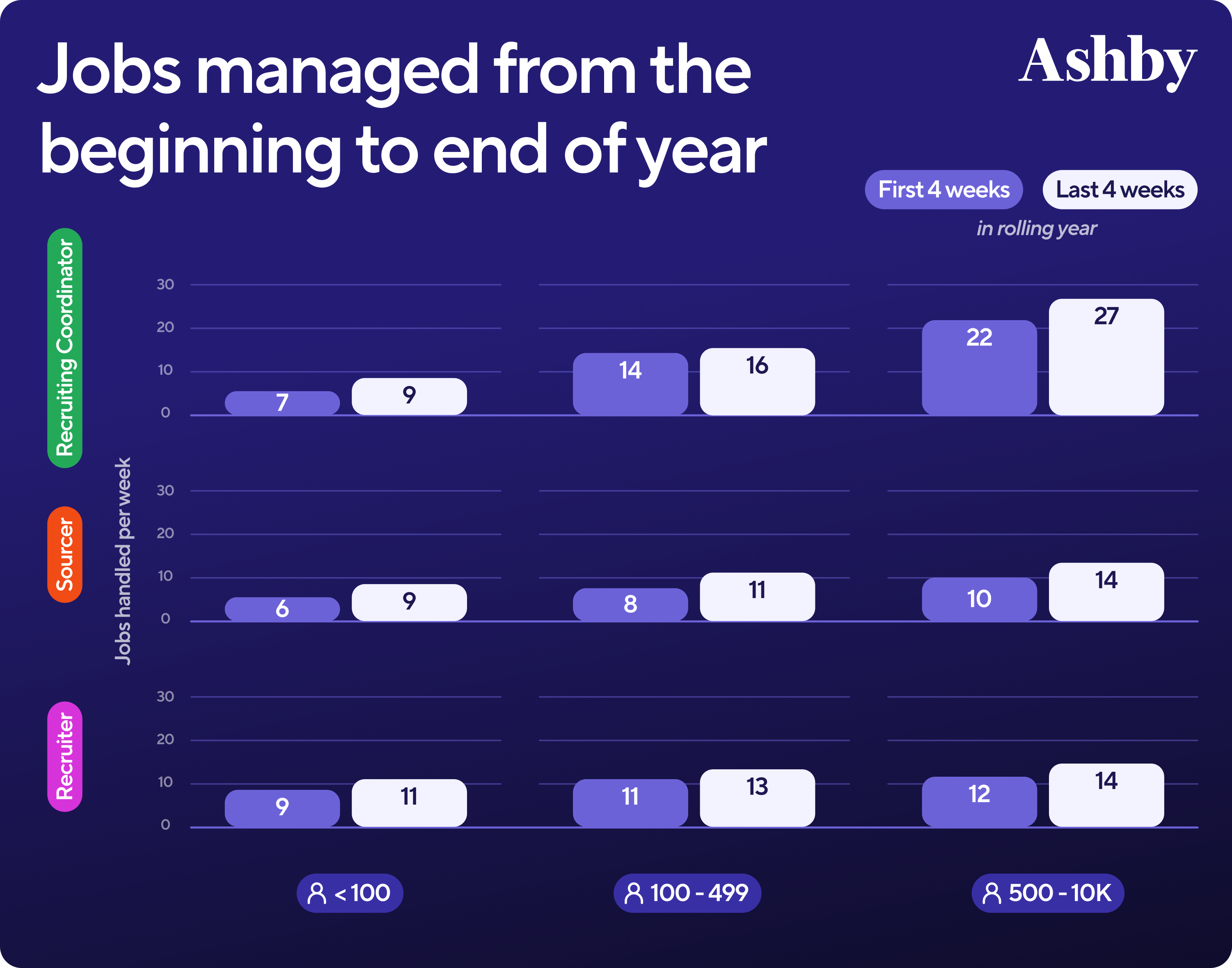 In other words, we define recruiter capacity through activity by pulling the active jobs a talent professional worked on that week. So while you could be responsible for 40 jobs that quarter, you may have only been working actively on three in said week. Said another way, we analyzed how many jobs a talent professional is managing in an active way each week.